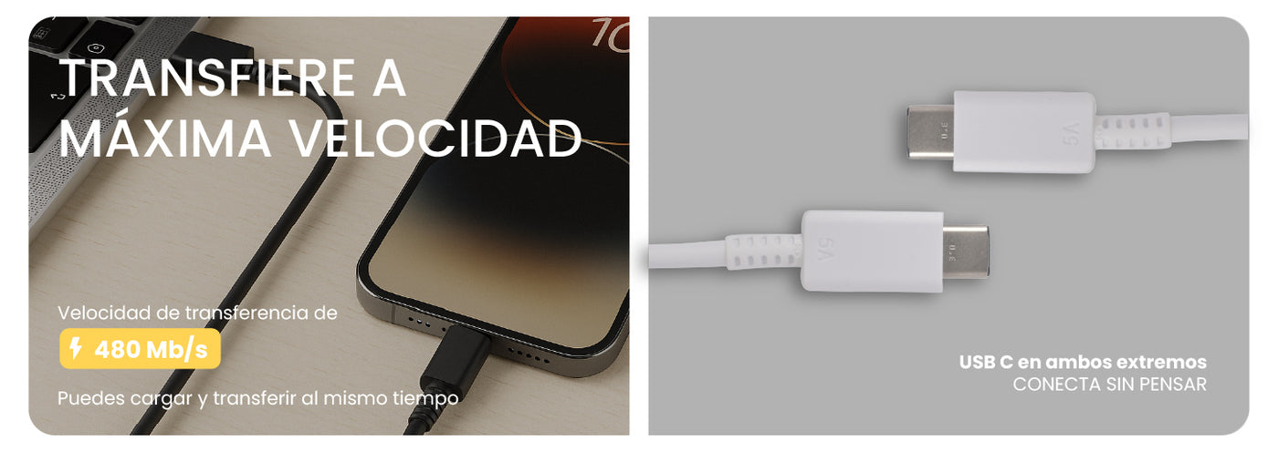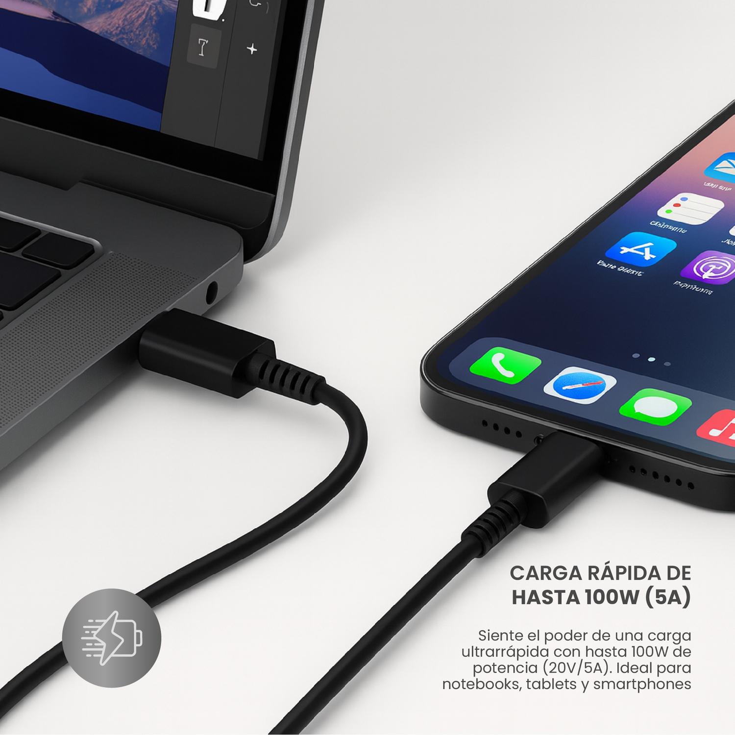 Con una potencia de carga de 100W (5A), es perfecto para tus laptops, tablets y smartphones más exigentes. Su longitud de 1 metro te da la libertad que necesitas para usar tus dispositivos cómodamente mientras se cargan, ya sea en tu escritorio, en el sofá o en la cama.