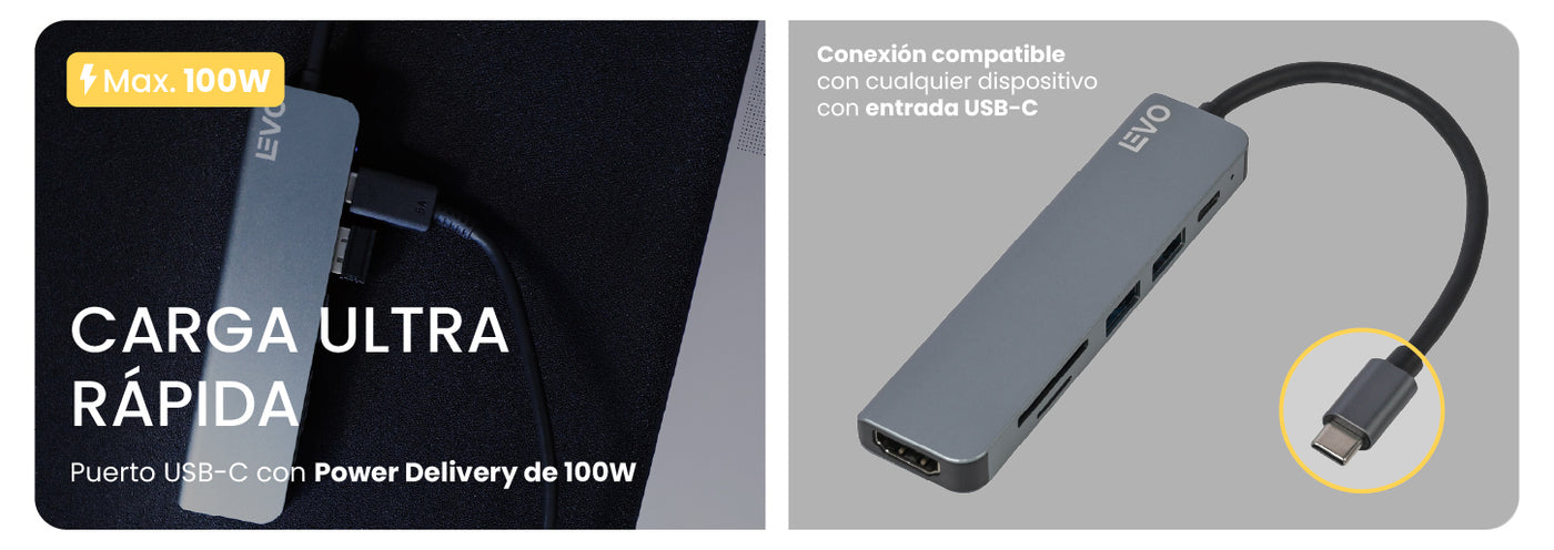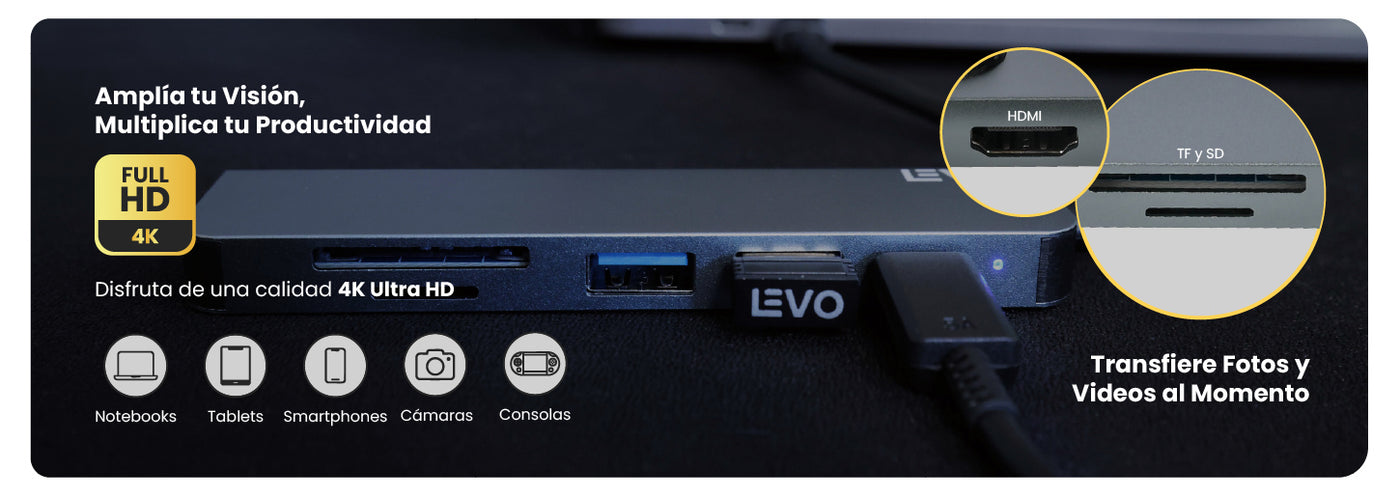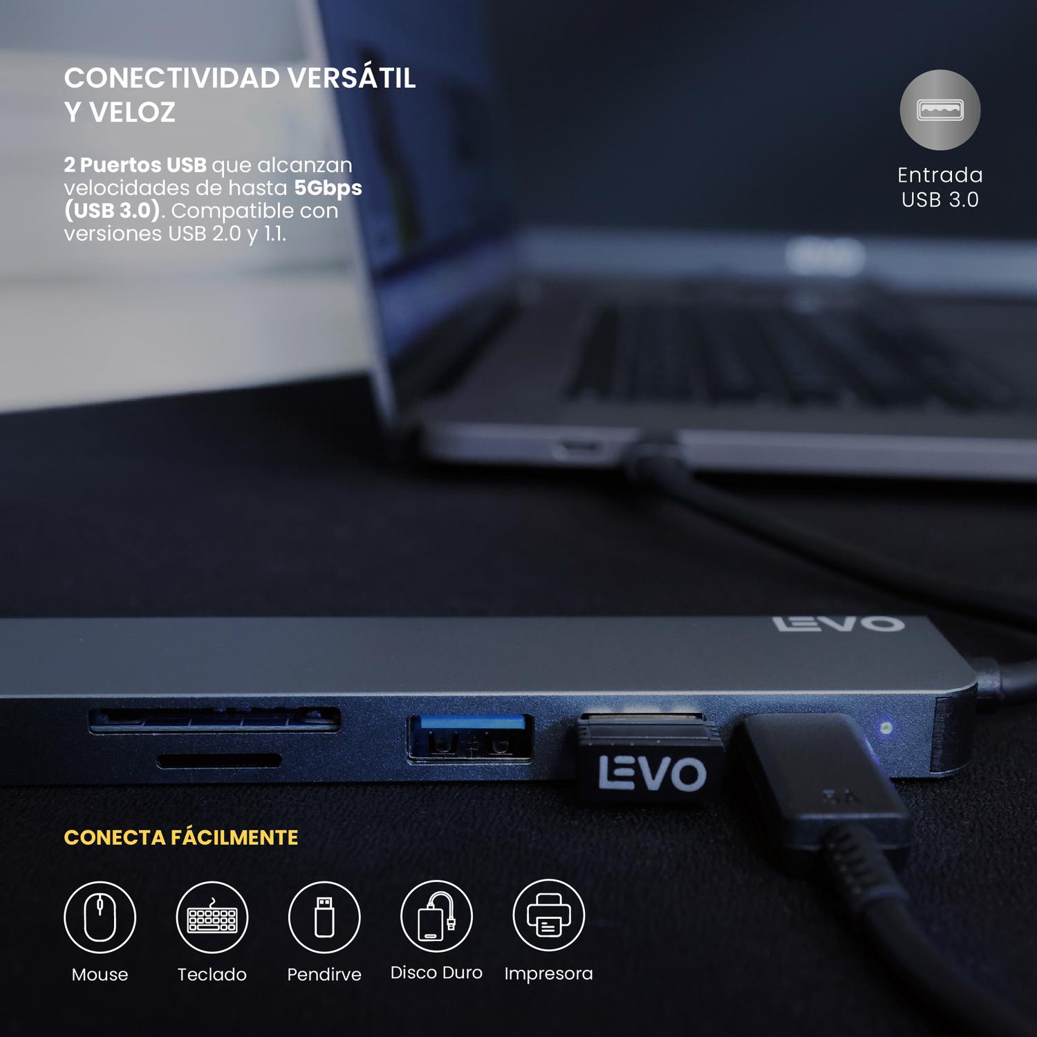 Expande la conectividad de tu laptop, PC o tablet con este Hub USB-C Adaptador Multipuerto 6 en 1 LEVO. Conéctalo al puerto USB-C de tu equipo para acceder a múltiples puertos sin sacrificar velocidad ni rendimiento.