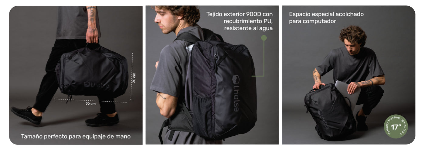 Con dimensiones perfectas para equipaje de mano (56x30x25 cm), te ahorra tiempo y costos de facturación. Su innovación clave es el arnés convertible: en segundos, oculta las correas de hombro y el cinturón lumbar para transformar la mochila en un elegante bolso de mano, adaptándose a cualquier entorno profesional o casual.