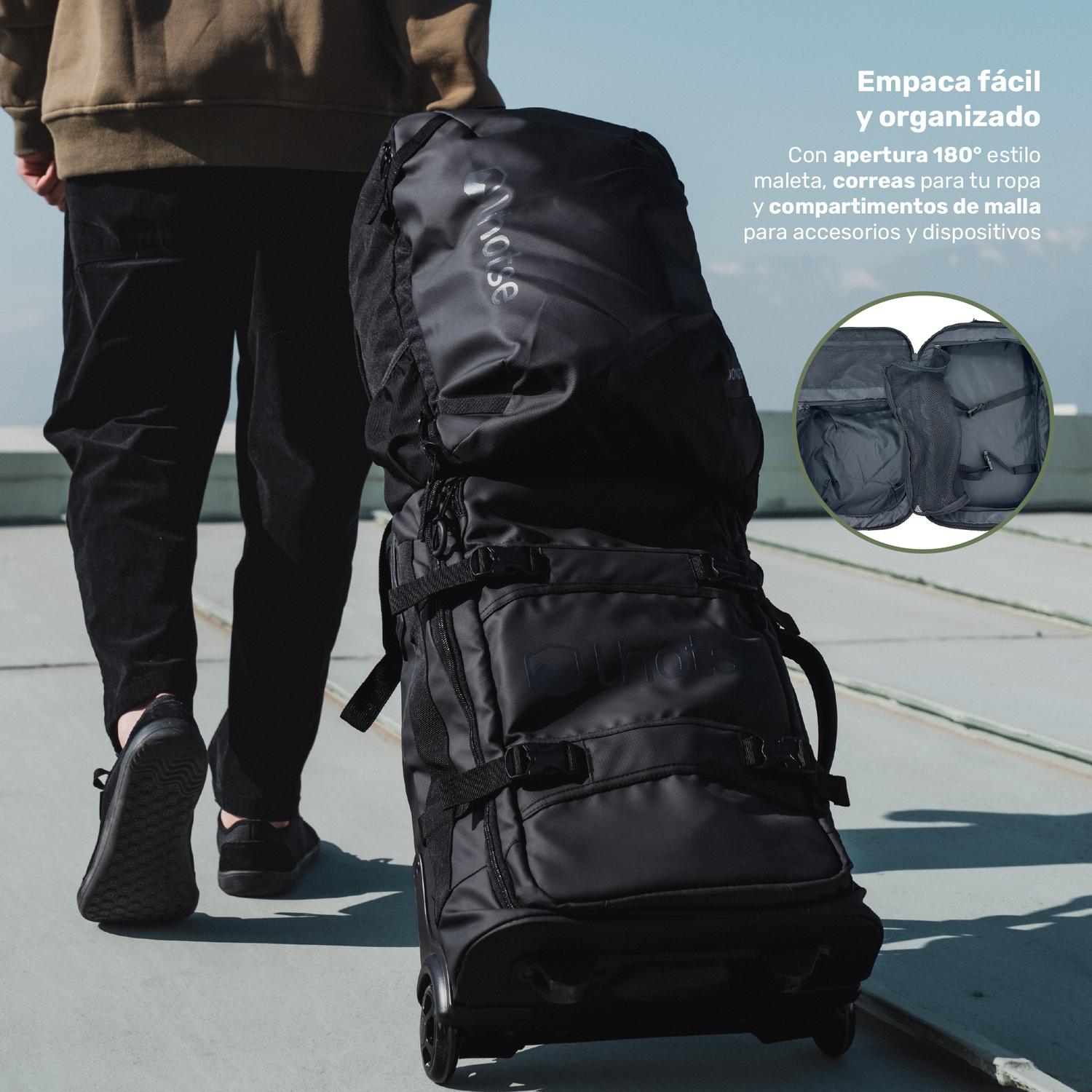 Su apertura completa de 180° tipo maleta ofrece un control visual total. Un compartimento con correas de compresión fija tu ropa y optimiza el espacio. El otro lado, con sus divisores de malla, organiza tus accesorios y dispositivos a la perfección.