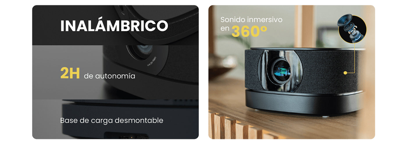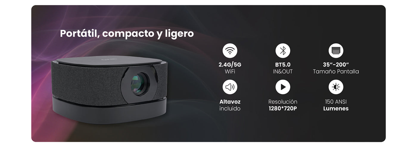 • Portabilidad y Adaptabilidad: Disfruta de una pantalla de hasta 200 pulgadas con enfoque electrónico fácil de ajustar. Su diseño compacto y batería integrada (3000 lúmenes) te permiten llevarlo a cualquier lugar.