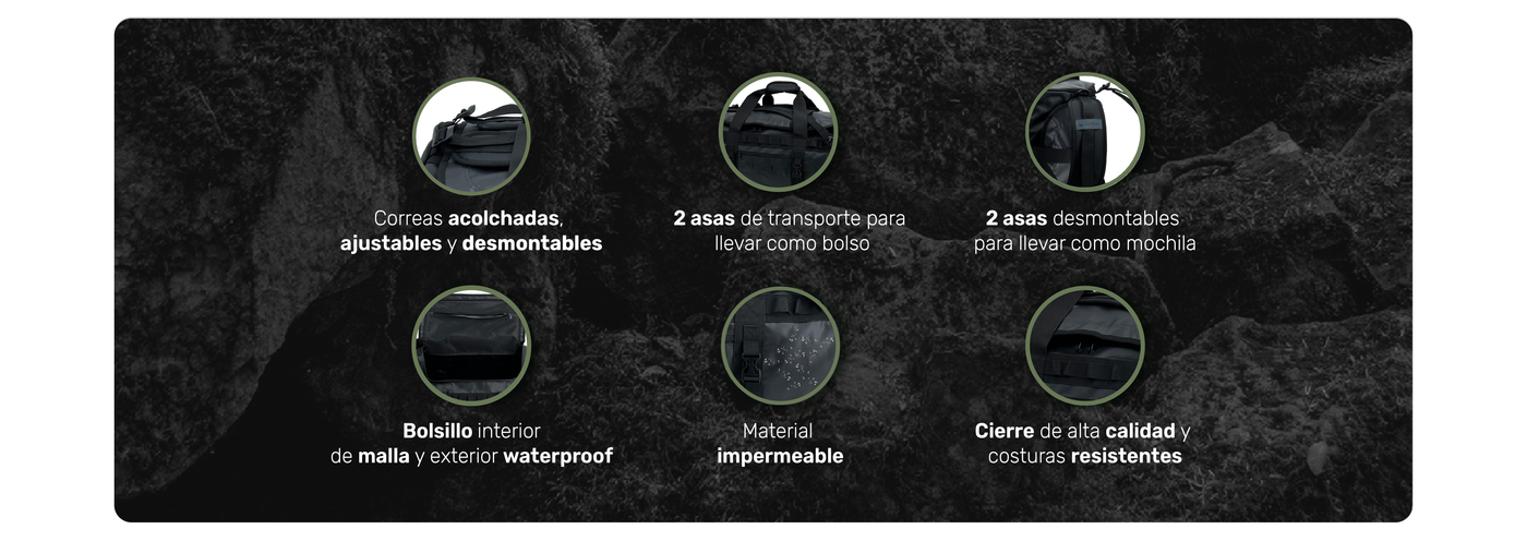 • Construcción 100% impermeable con material 500D Tarpaulin.