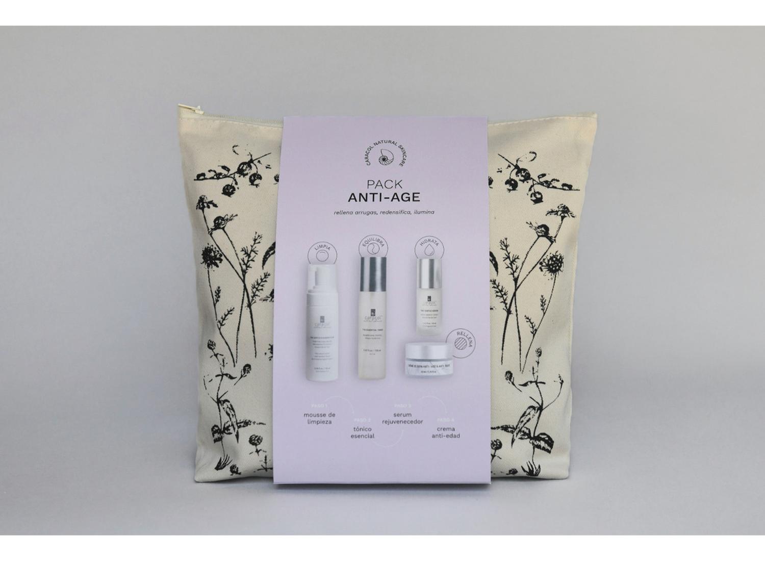Pack para humectar y reducir líneas de expresión y arrugas, +25 años, piel mixta a seca. Este pack anti age, Limpia con nuestro suave mousse sin intervenir nuestra barrera de piel natural. Tonifica e hidrata con nuestro tónico calmante y neutraliza el ph a 5,5. Y sella la hidratación nuestra crema anti age que humecta y promueve la regeneración celular. Secreción filtrada de caracol (SSF)