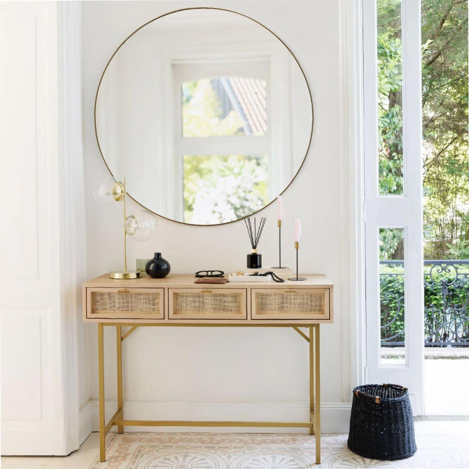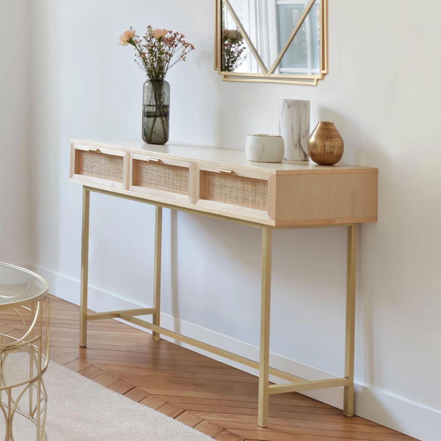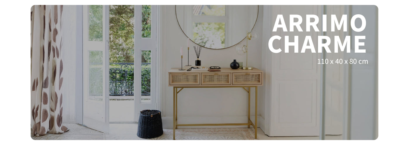El arrimo “Charme” es una pieza versátil y elegante que combina materiales naturales y detalles modernos. Ideal para entradas, salones o pasillos, cuenta con dos amplios cajones para organizar accesorios, papelería o decoración. Su diseño mezcla chapa de abedul, detalles en caña natural y base de acero, lo que lo convierte en un mueble atemporal, fácil de integrar en distintos estilos decorativos. Aporta calidez, orden y un aire sofisticado a cualquier ambiente.