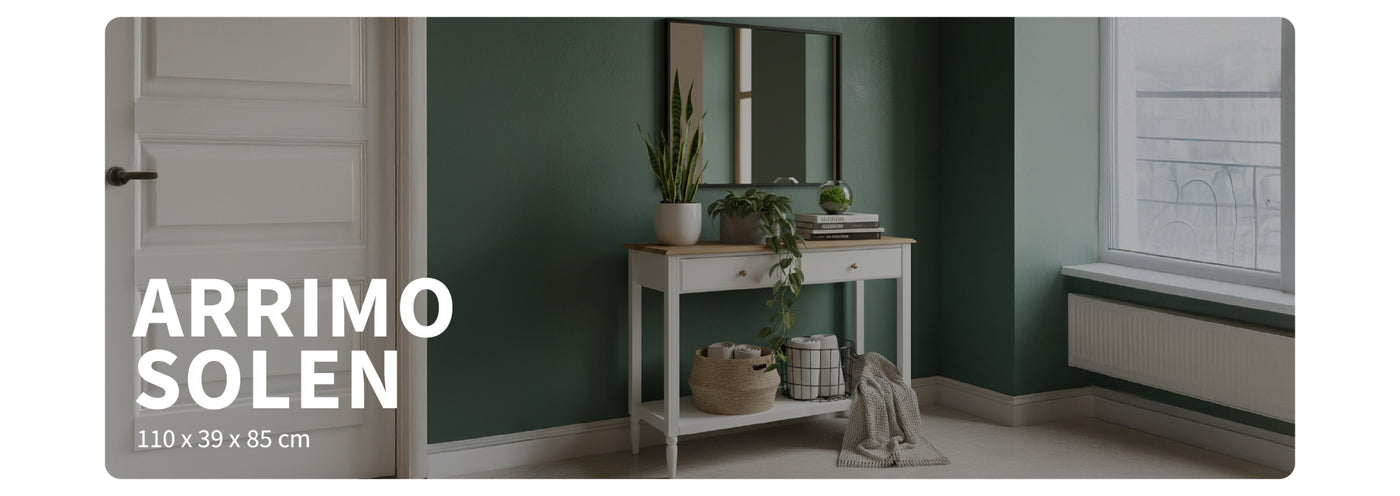El arrimo Solen combina funcionalidad y estilo con un diseño que destaca por sus líneas limpias y acabados cuidados. Su estructura incorpora dos cajones espaciosos ideales para guardar pequeños accesorios, mientras su superficie es perfecta para exhibir una lámpara, un florero o tus objetos decorativos favoritos.