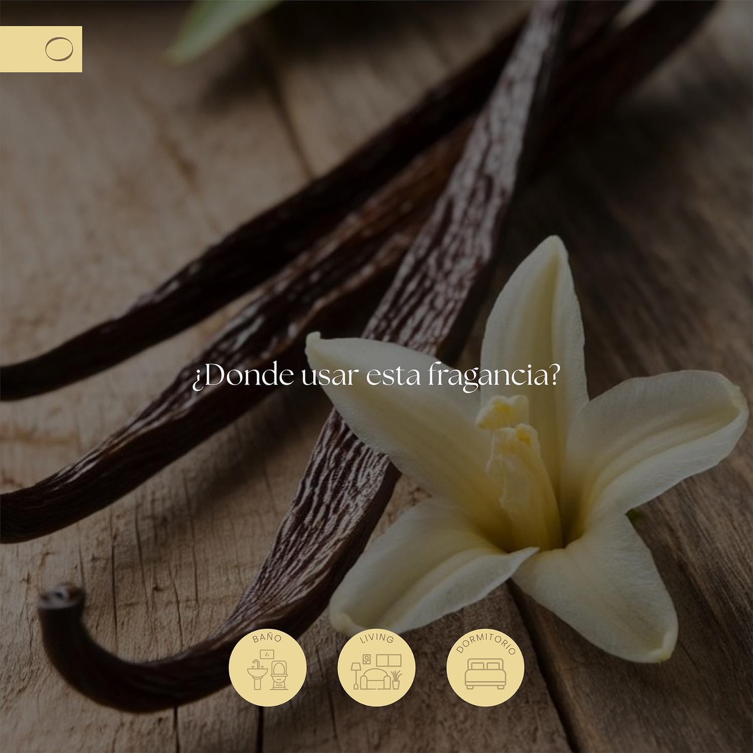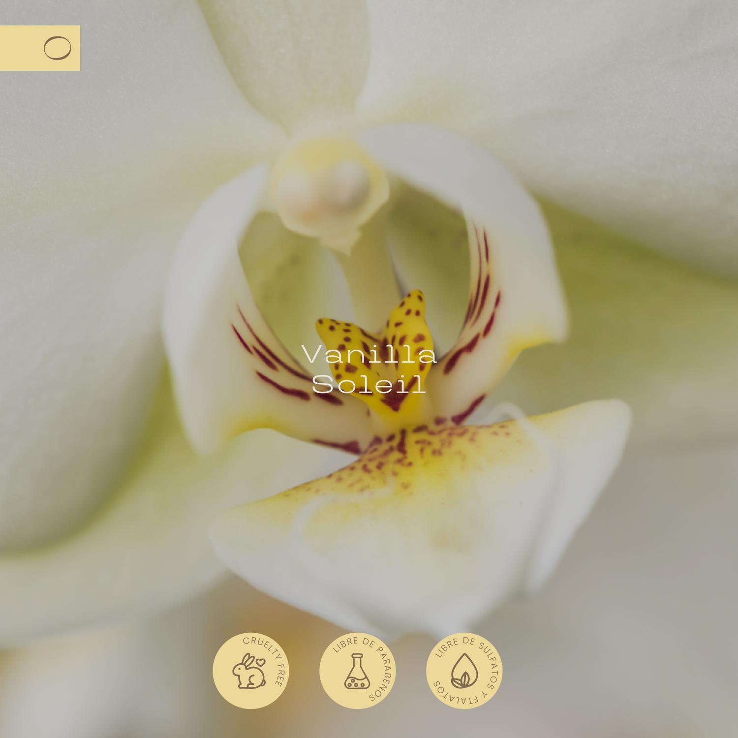 Vanilla Soleil; ilumina el ambiente con la suavidad cremosa de la vainilla y la calidez de notas herbales y amaderadas. Un aroma solar, envolvente y veraniego, que recuerda a la ligereza del sol sobre la piel: reconfortante, luminoso y lleno de vida, creando atmosferas de absoluto confort y relajación.