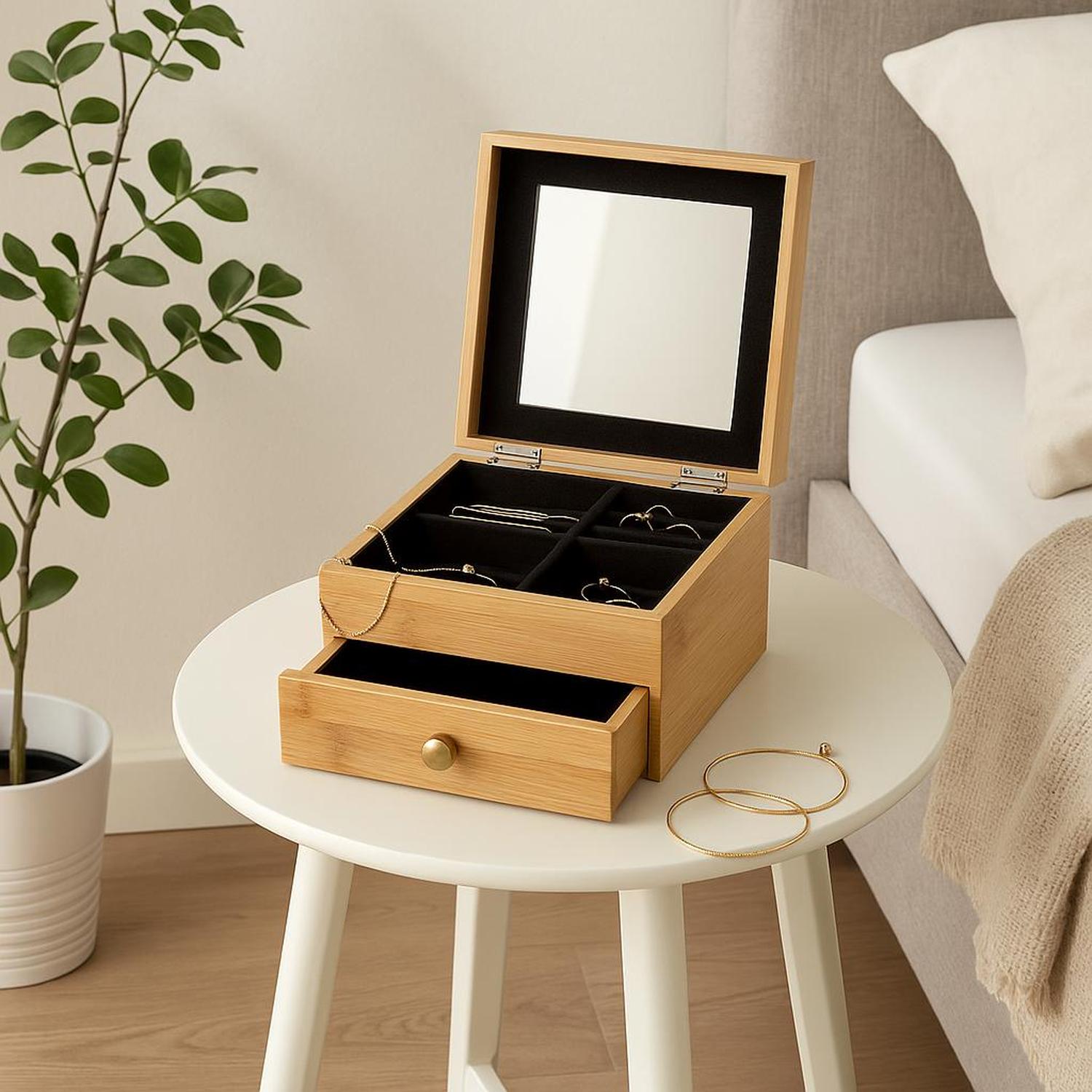Dale a tus accesorios el lugar que merecen con este práctico joyero de bambu. No solo organiza tus tesoros, sino que también añade un toque natural y cálido a tu espacio. Como organizador de joyas, cuenta con un espejo integrado y compartimentos funcionales para que encontrar el accesorio perfecto cada mañana sea más simple y rápido.