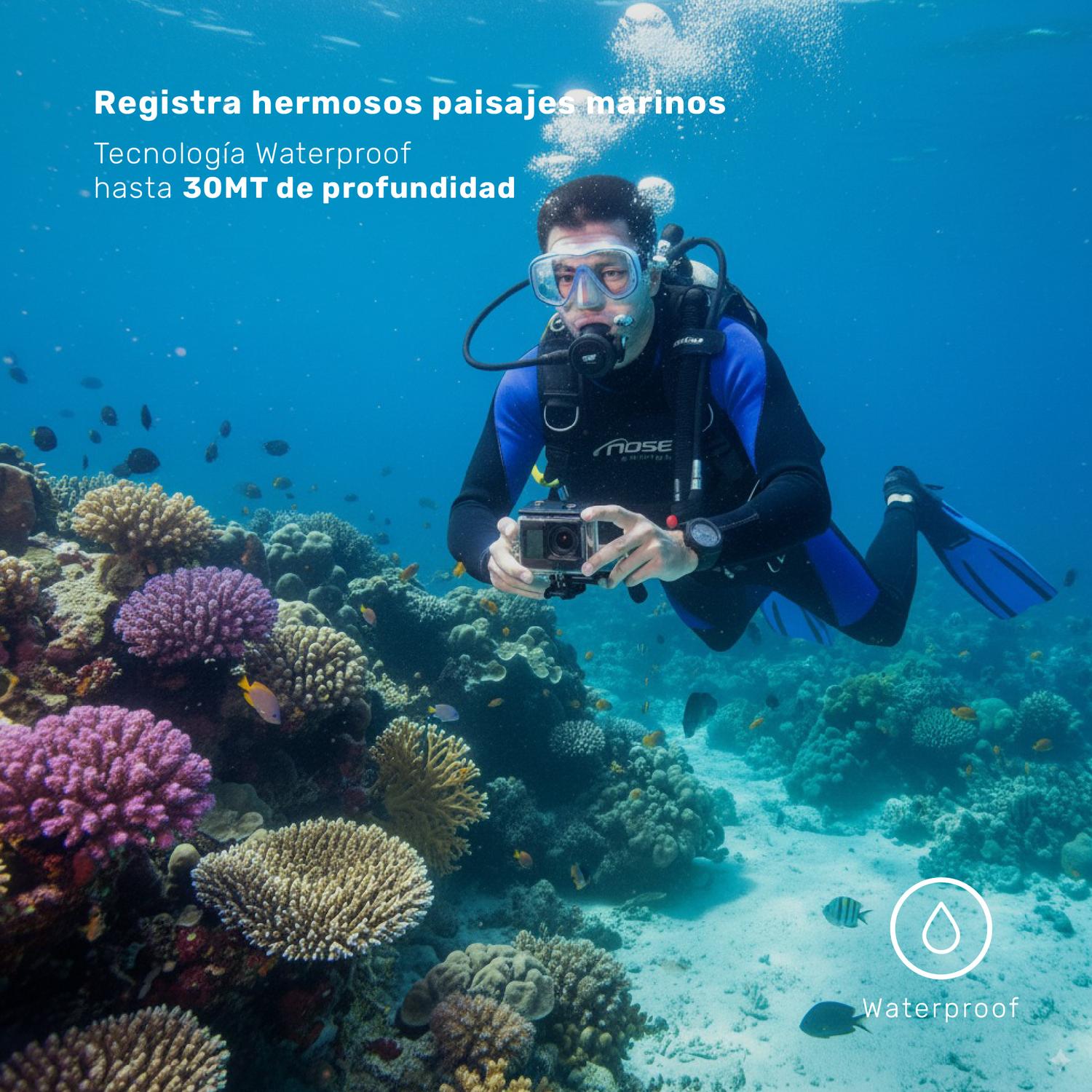 Diseñada para superar límites, es sumergible hasta 30 metros y cuenta con una capa de vidrio 4G para máxima protección en condiciones extremas. Su batería de 1050mAh y compatibilidad con tarjetas de memoria de hasta 64GB clase 10 te permiten grabar sin interrupciones durante toda tu aventura.