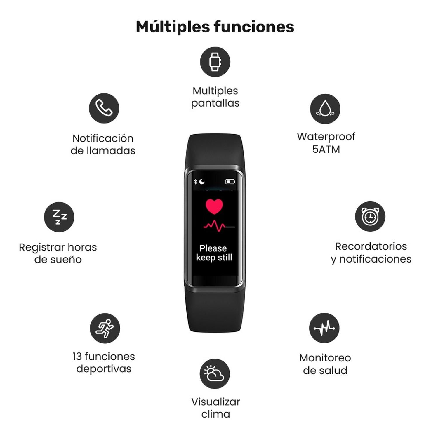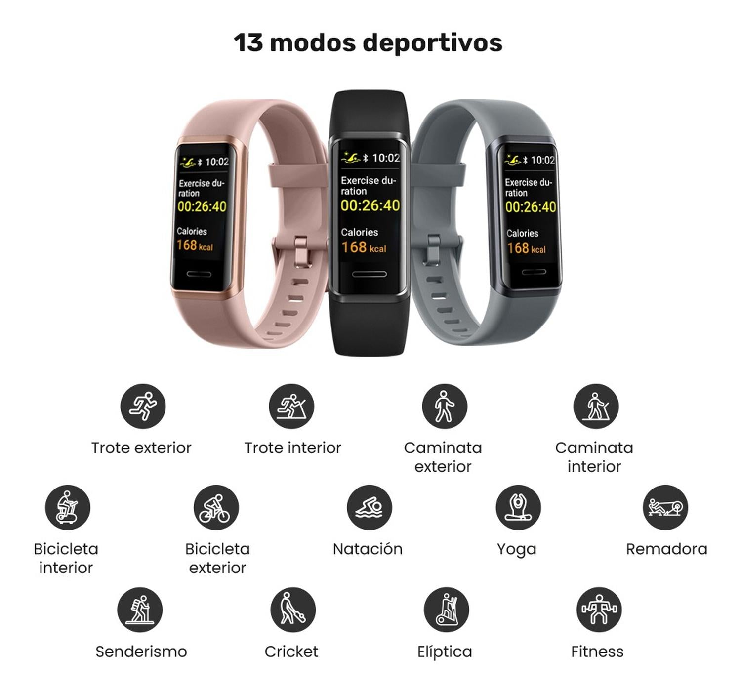 • 13 modos deportivos: trote interior y exterior, caminata interior y exterior, bicicleta interior y exterior, cricket, senderismo, natación, yoga, remadora, elíptica, fitness.