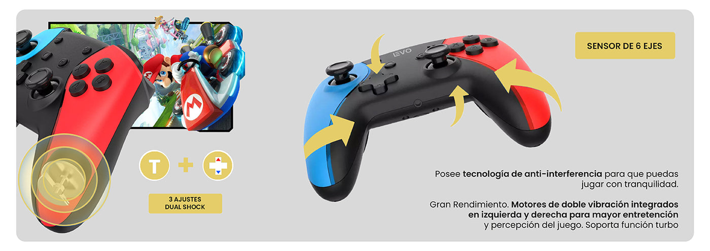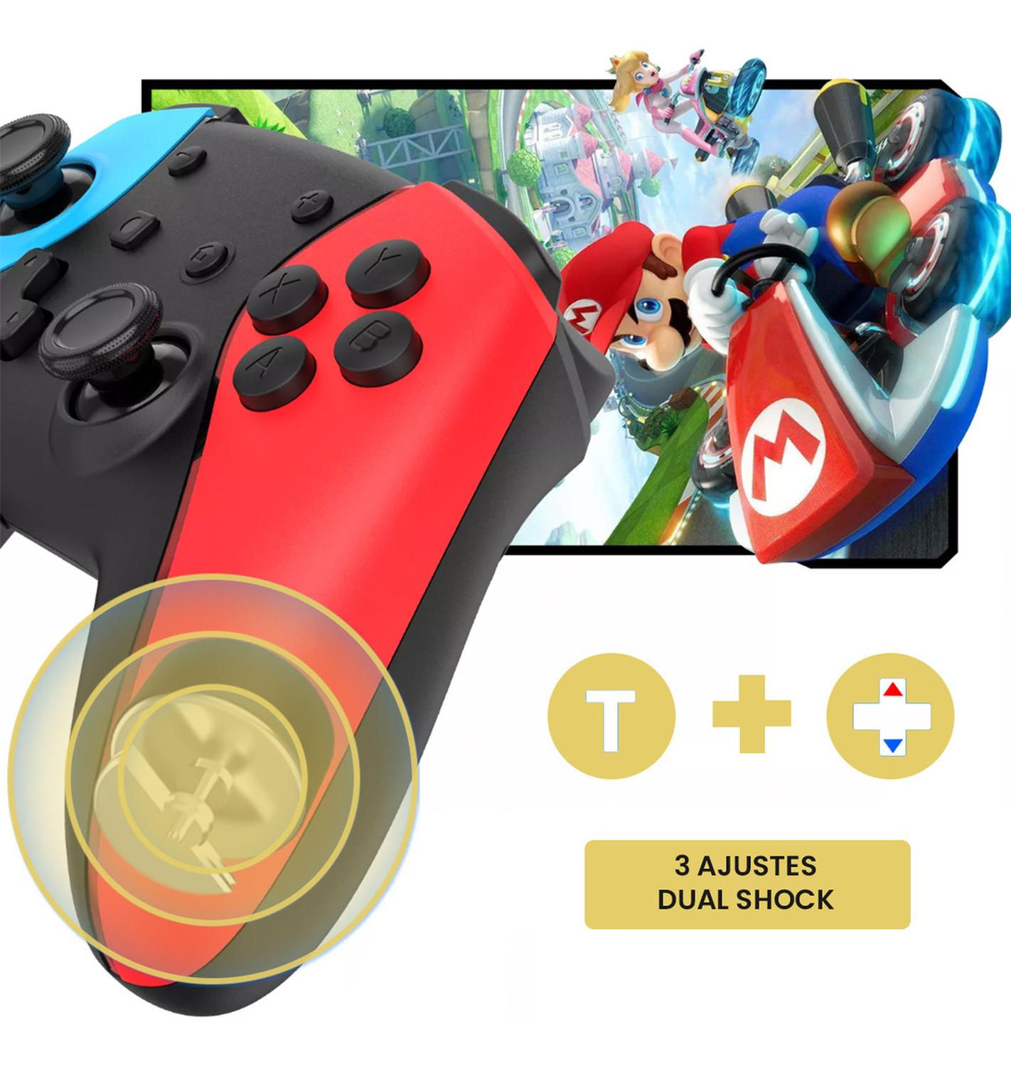 Motores de doble vibración integrados en izquierda y derecha para mayor entretención y percepción del juego. Soporta función turbo y cuenta con un sensor de 6 ejes. Sin NFC.