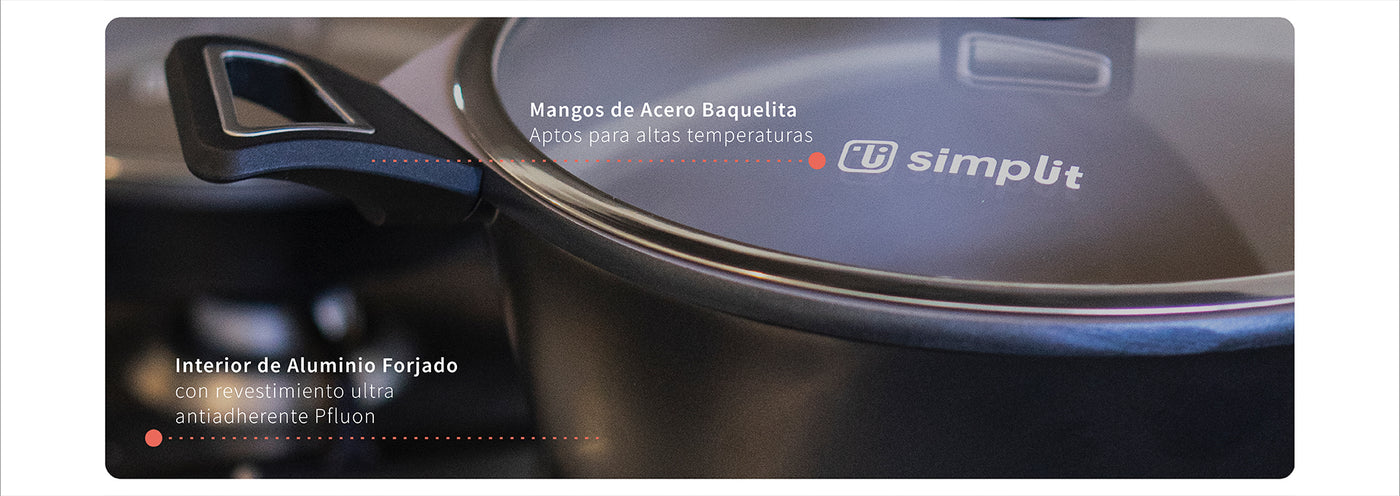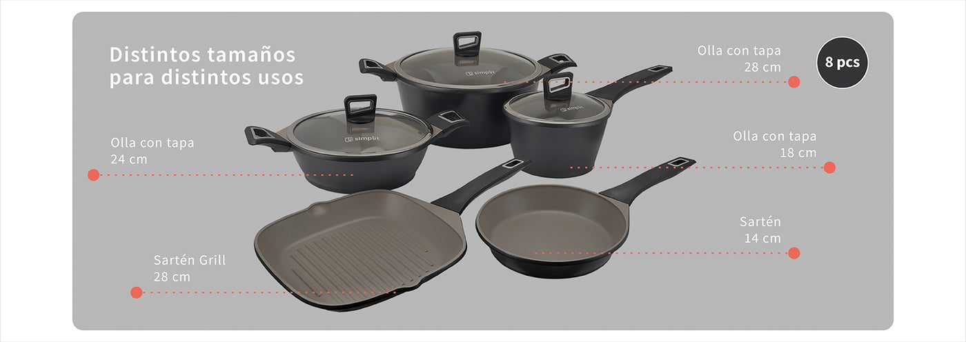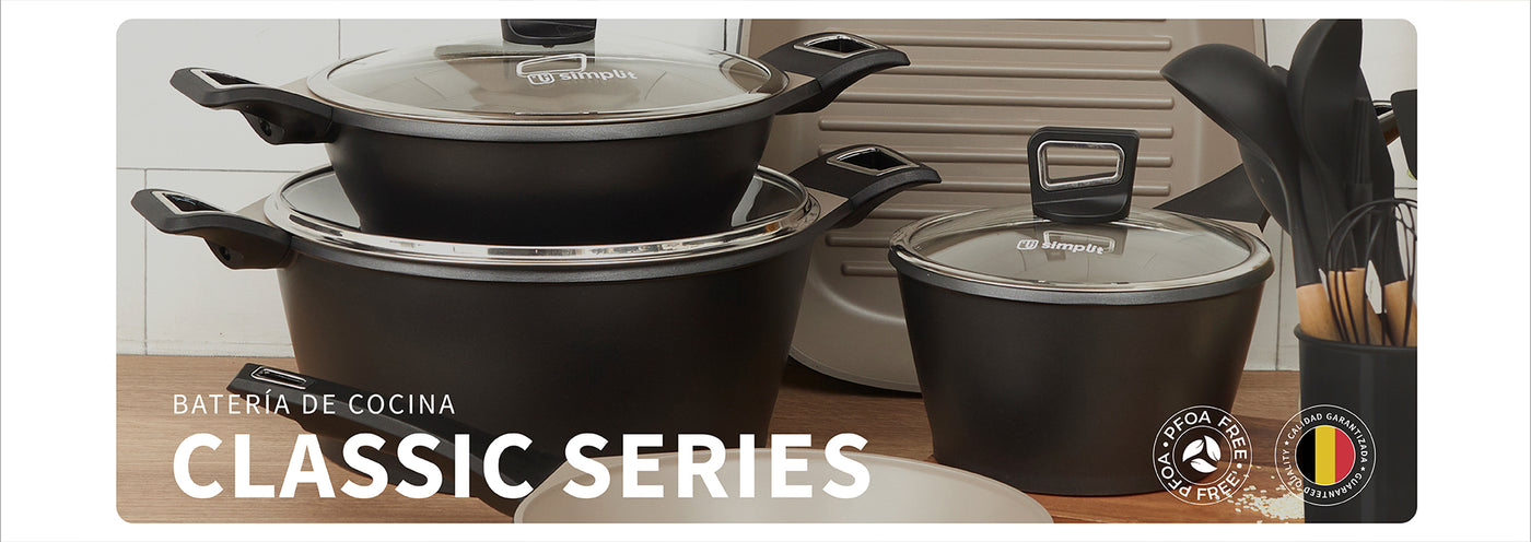Batería de Cocina Antiadherente Classic 8 Piezas Simplit Nuestra Batería de Cocina Classic Series incluye ollas y sartenes de distintos tamaños y formas para brindarte un set completo con todo lo que necesitas. La batería es de aluminio fundido a presión con revestimiento antiadherente Pfluon qué puede conducir el calor de manera más rápida y uniforme. Su revestimiento exterior resiste a altas temperaturas. Las ollas tienen asas laterales de baquelita para mantener los mangos a baja temperatura durante la cocción. Es apta para todo tipo de cocinas incluidas las de inducción.