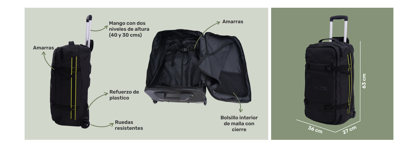 Ya sea que tu aventura te lleve a escalar montañas, a recorrer ciudades o a explorar horizontes desconocidos, la Maleta Bolso Roadtrip se adapta a todas tus necesidades. Equipada con ruedas duraderas, te permite moverte con facilidad por aeropuertos, calles empedradas o senderos naturales. Y si te encuentras con un terreno desafiante, sus prácticos mangos te permiten llevarla fácilmente a cualquier lugar.
