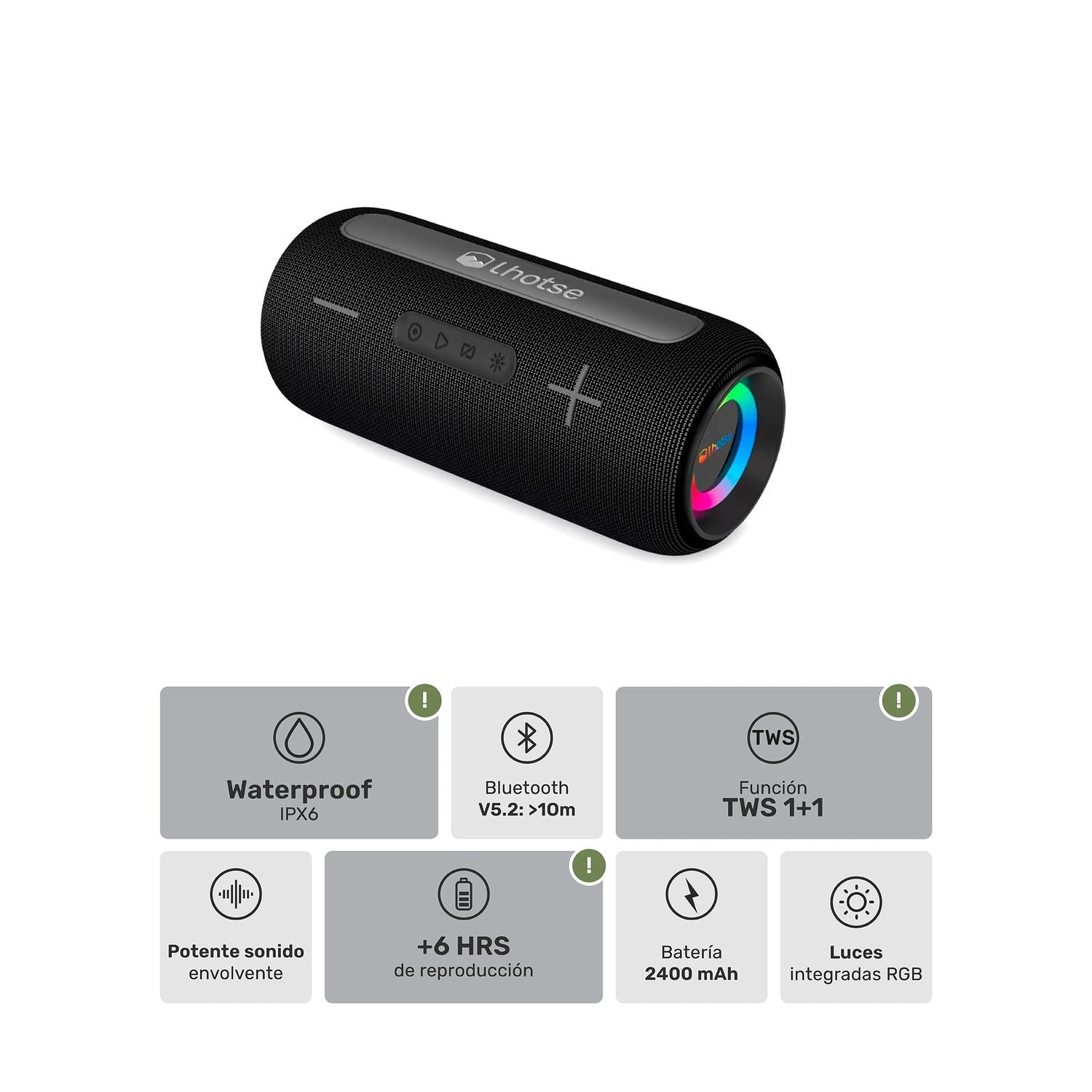 Disfruta de un sonido envolvente y potente con sus 16W de potencia RMS, mientras que su batería de 2400mAh te brinda más de 6 horas de reproducción continua. Su función TWS (True Wireless Stereo) permite emparejar dos parlantes para una experiencia de sonido estéreo aún más inmersiva.
