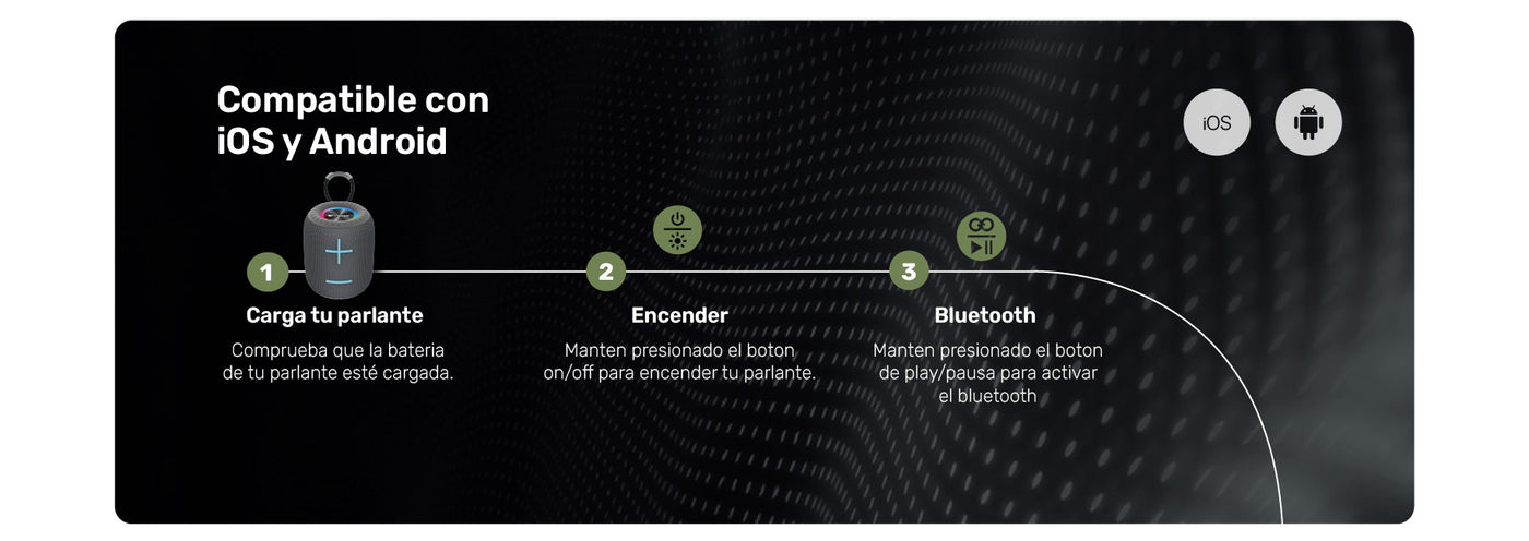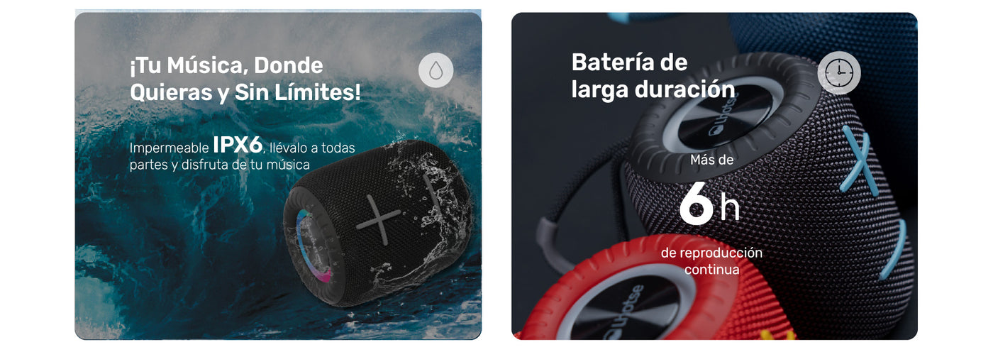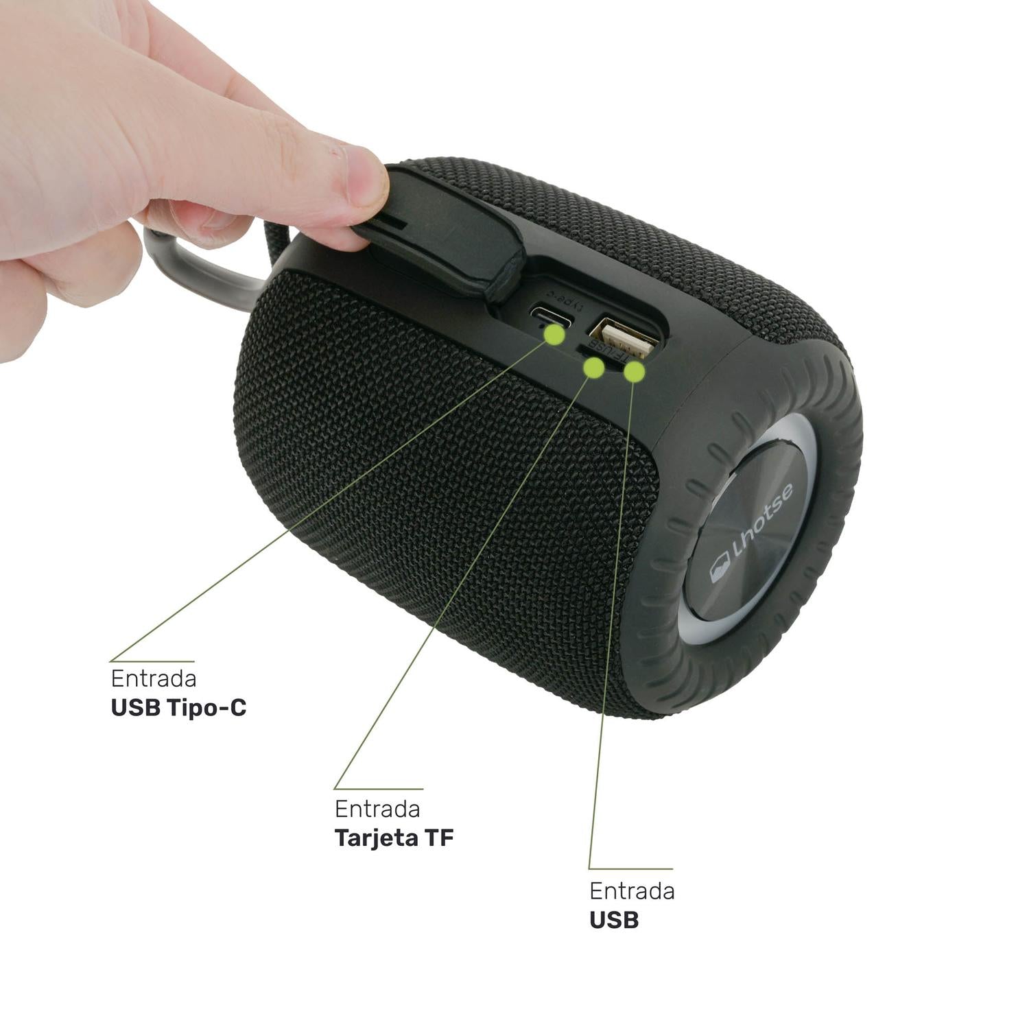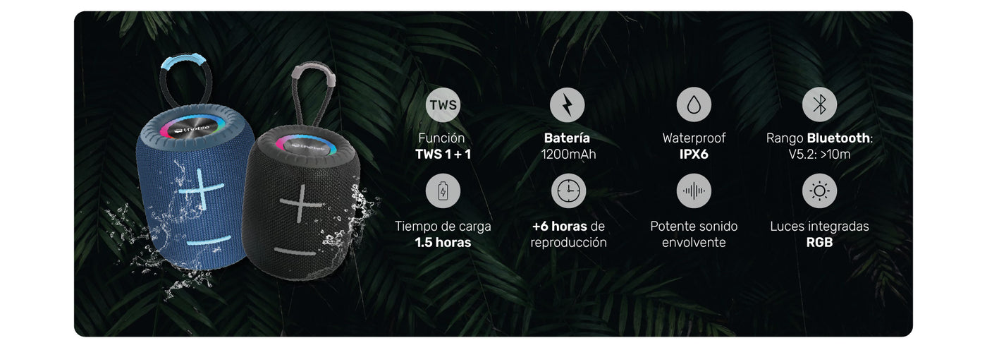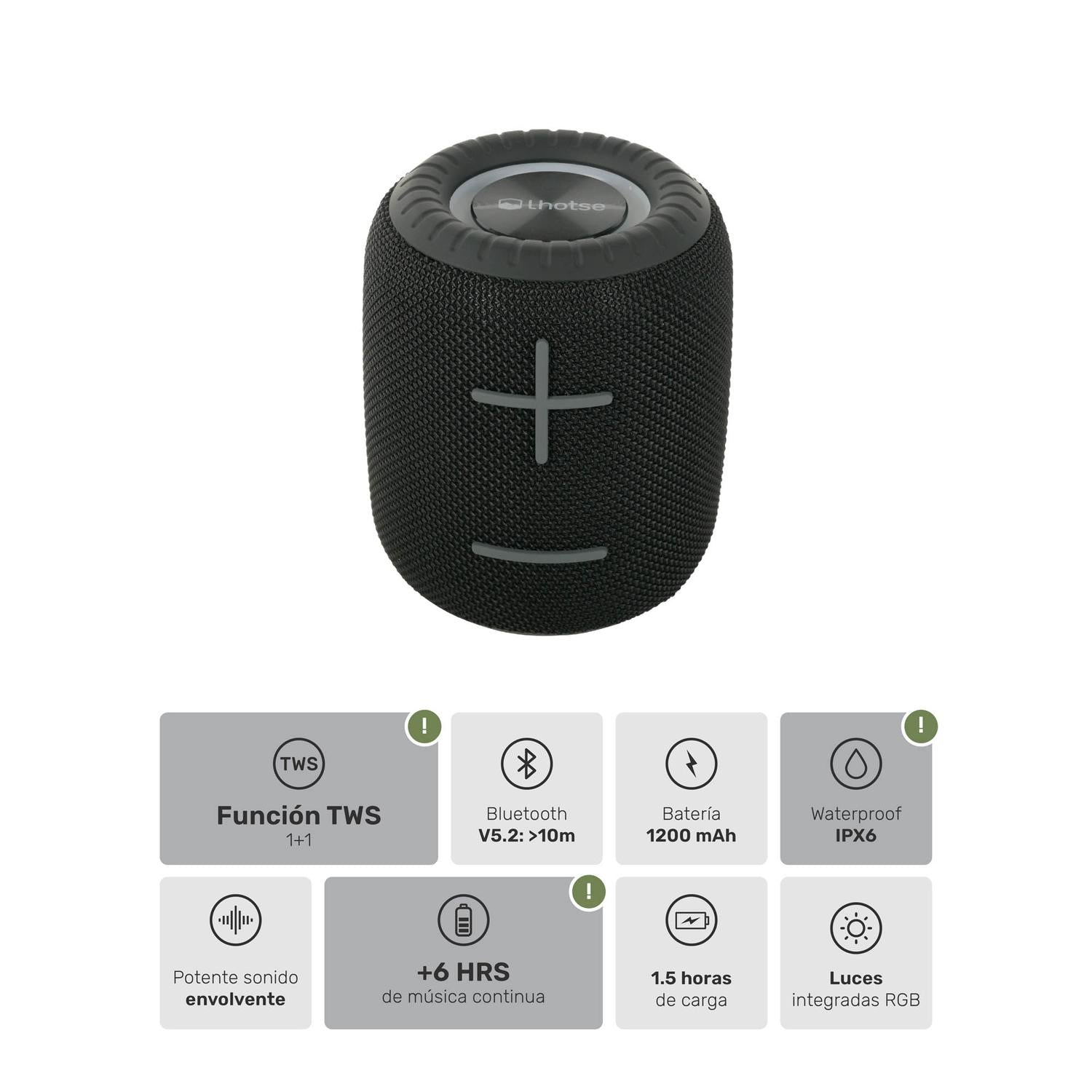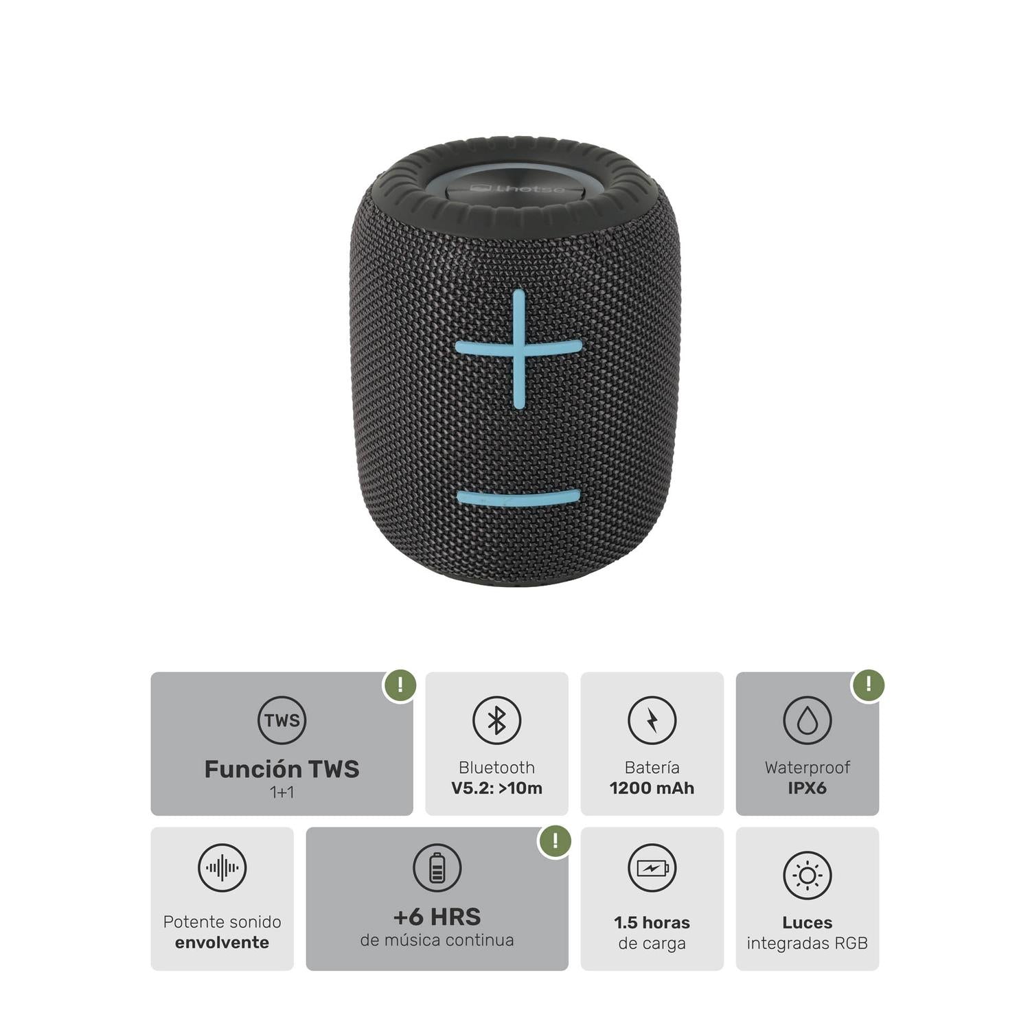 Disfruta de un sonido claro con 6W RMS de potencia, luces RGB integradas y una batería recargable de 1200mAh que ofrece + de 6 horas de reproducción. Su conectividad Bluetooth 5.2 garantiza estabilidad y compatibilidad con todos tus dispositivos.