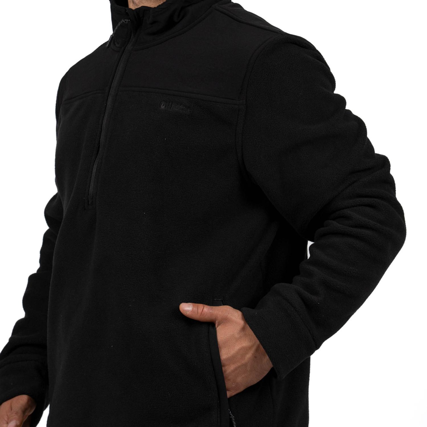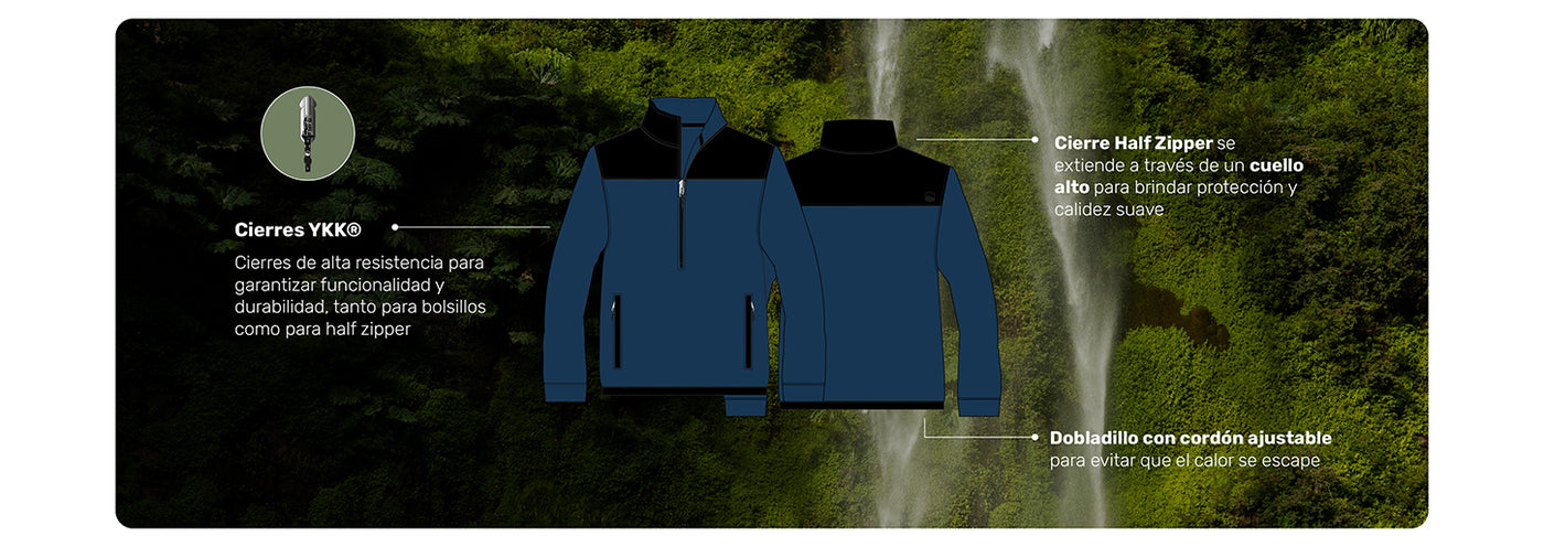 •  Cierre Half Zipper se extiende a través de un cuello alto para brindar protección y calidez suave.