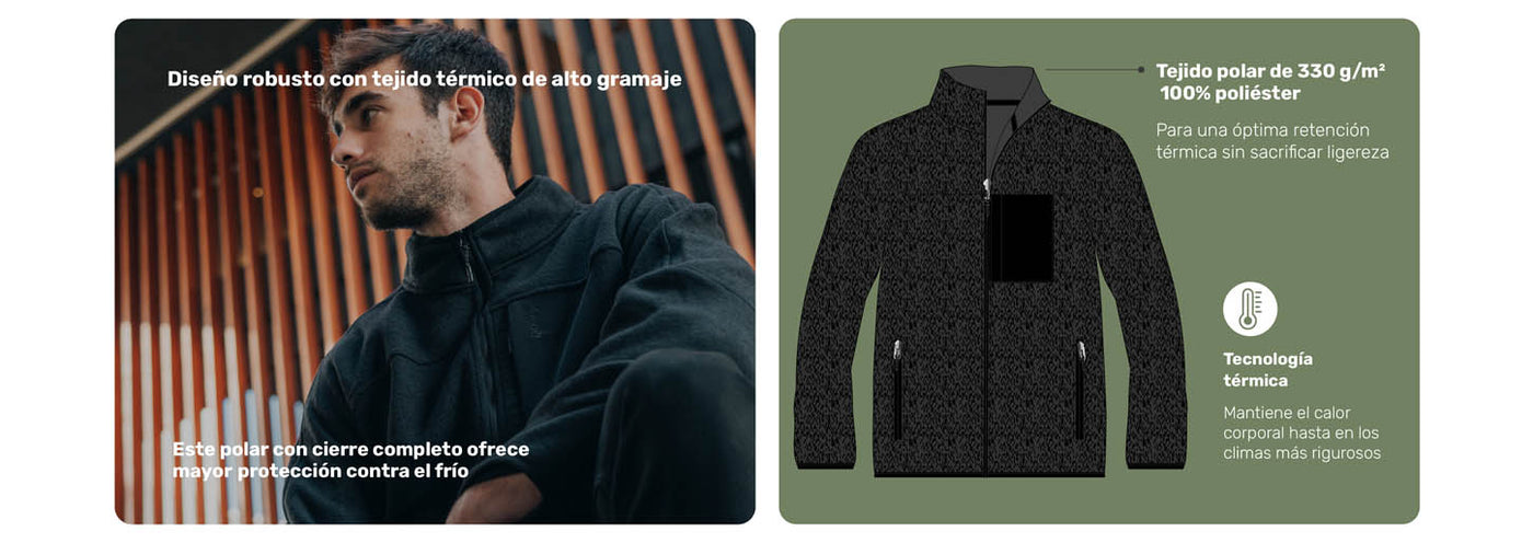 • Tejido polar de 330 g/m²: 100% poliéster para una óptima retención térmica sin sacrificar ligereza.
