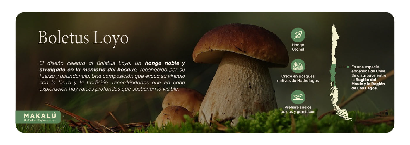 • El diseño celebra al Boletus Loyo, un hongo noble y arraigado en la memoria del bosque, reconocido por su fuerza y abundancia. Una composición que evoca su vínculo con la tierra y la tradición, recordándonos que en cada exploración hay raíces profundas que sostienen lo visible.