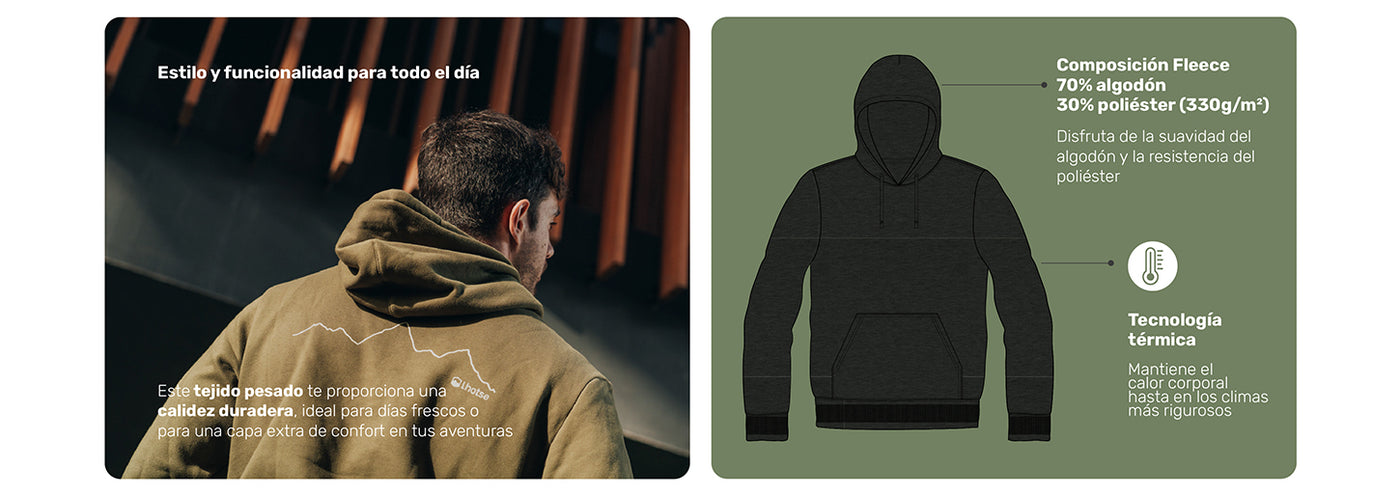 • Composición Fleece 70% algodón, 30% poliéster (330g/m²): Disfruta de la suavidad del algodón y la resistencia del poliéster. Este tejido pesado te proporciona una calidez duradera, ideal para días frescos o para una capa extra de confort en tus aventuras.
