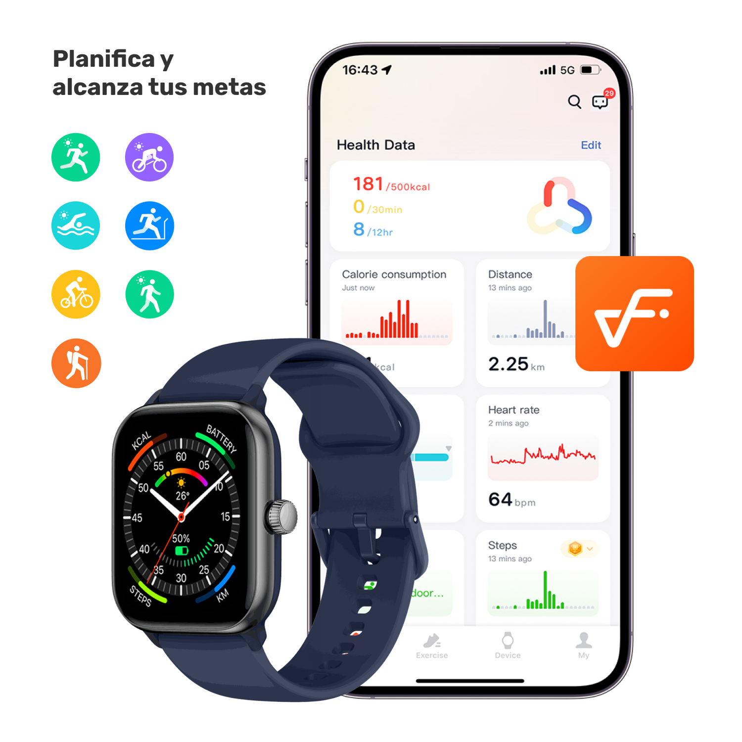 •    110 modos deportivos integrados (Running, ciclismo, golf, caminata, natación, etc)