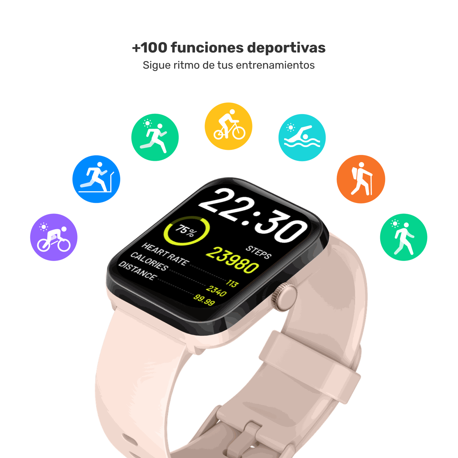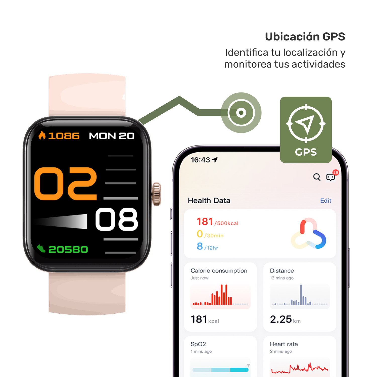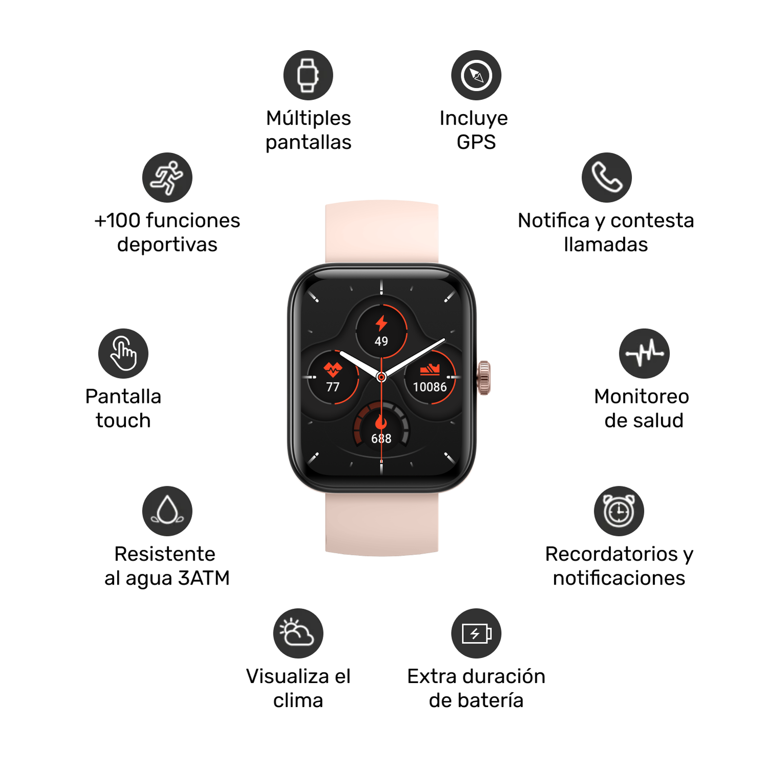 Con GPS integrado y conexión Bluetooth, permite hacer llamadas desde el reloj y recibir notificaciones de mensajes, redes sociales y clima. Además, es compatible con iOS y Android, y controla tu música directamente desde la muñeca.