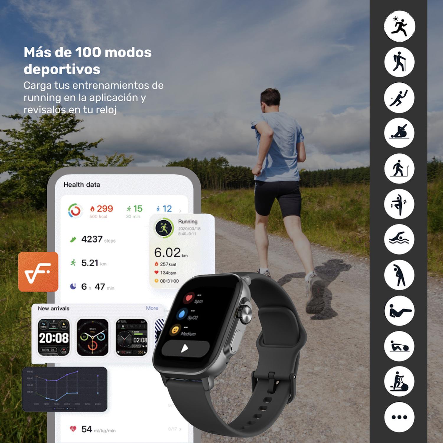 Optimiza tu entrenamiento sincronizando planes de running, monitorea la frecuencia cardíaca, oxigenación, stress y sueño. Con funciones prácticas como recordatorios inteligentes, control de música y Alexa integrado, el Connect S03 simplifica tu vida diaria. Recibe notificaciones, desde WhatsApp hasta recordatorios menstruales, y disfruta de una batería de 5-7 días con resistencia al agua IP68. El Connect S03 es más que un reloj; es tu compañero inteligente para cada momento.
