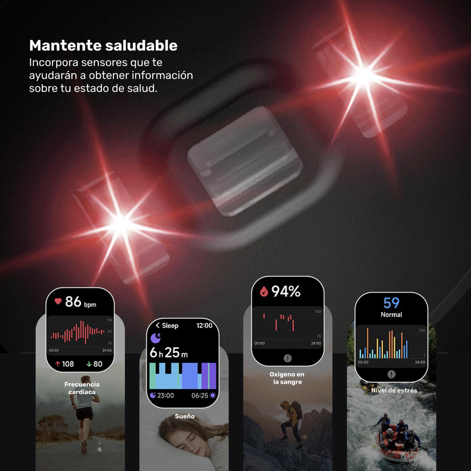 • Monitoreo de frecuencia cardiaca, oxigenación de la sangre, stress y sueño