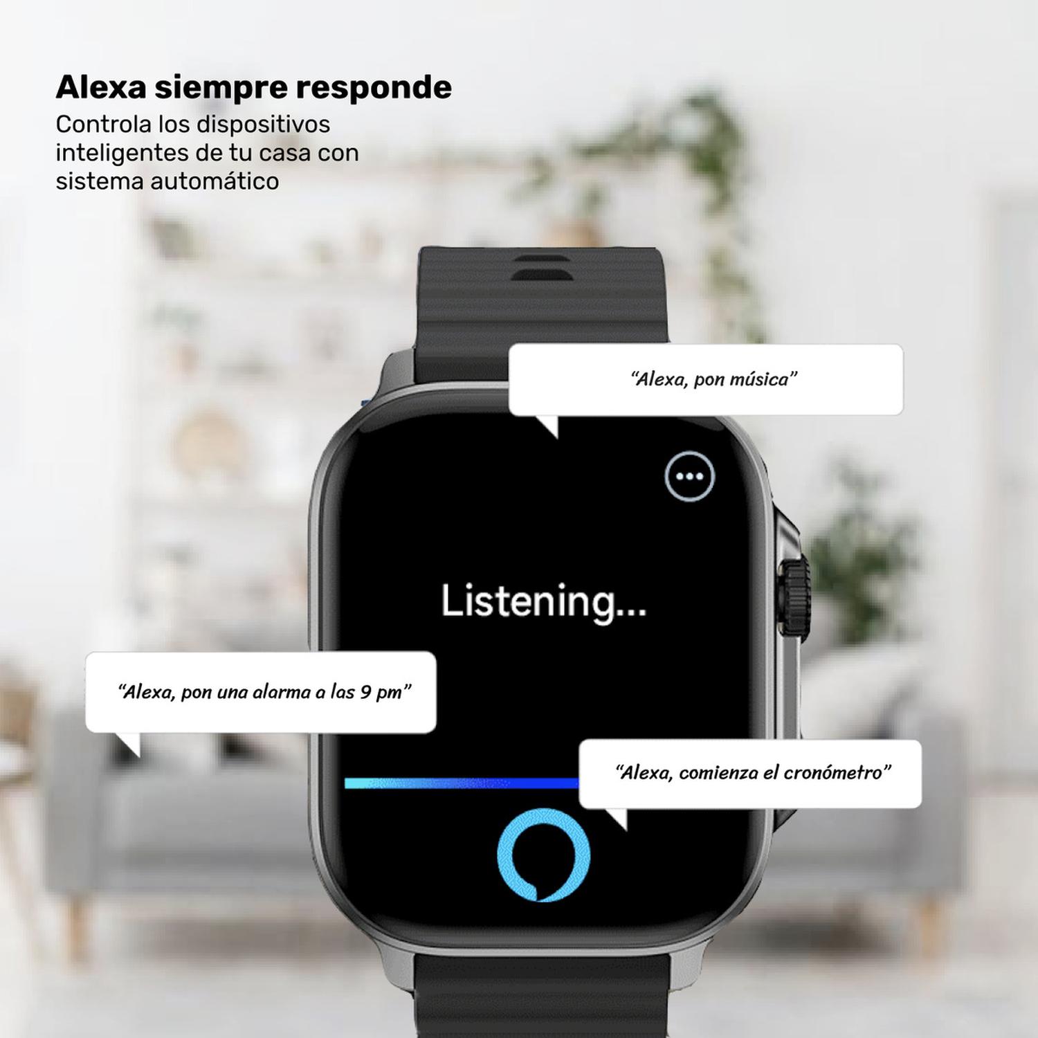 • Alexa integrado, háblale a tu smartwatch para pedirle que te de información o sincronizar alarmas.