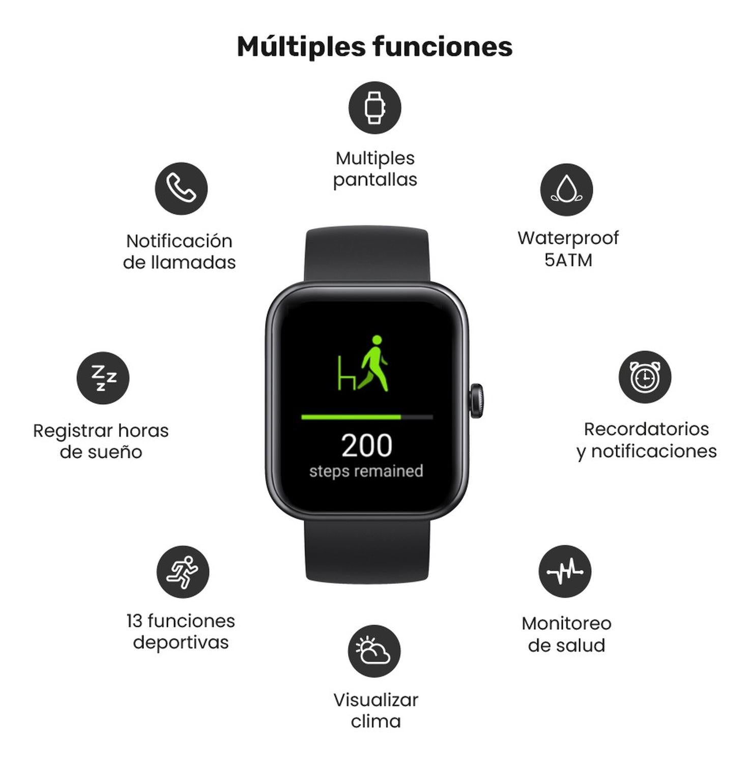 • Monitoreo de pasos, calorías y distancia.