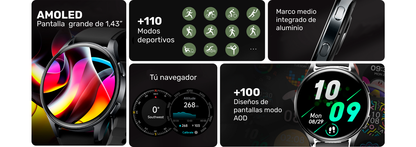 - +110 modos deportivos integrados, natacion, running, trecking, padel, etc.
