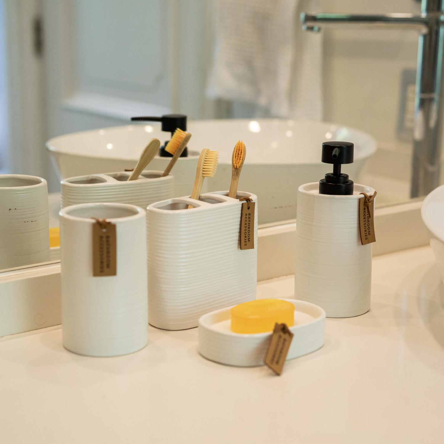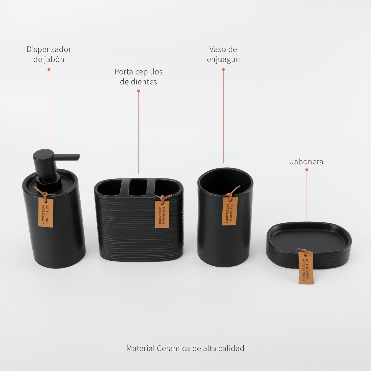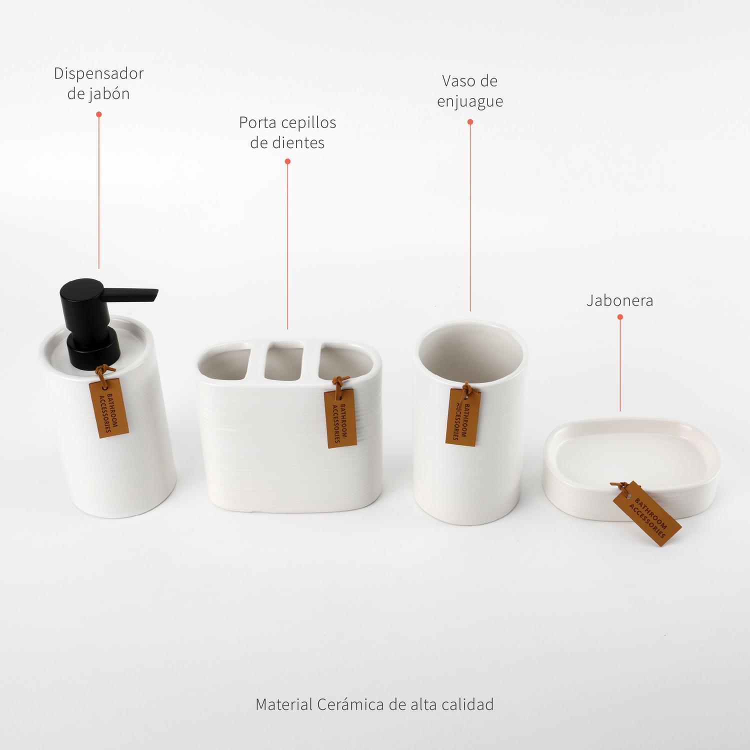El set incluye 1 dispensador de jabón líquido, 1 vaso, 1 vaso para cepillos y 1 jabonera, proporcionando todo lo necesario para mantener tu baño organizado y con estilo. Su acabado en cerámica aporta una sensación de lujo, convirtiendo este set en un detalle imprescindible para un baño moderno y funcional.
