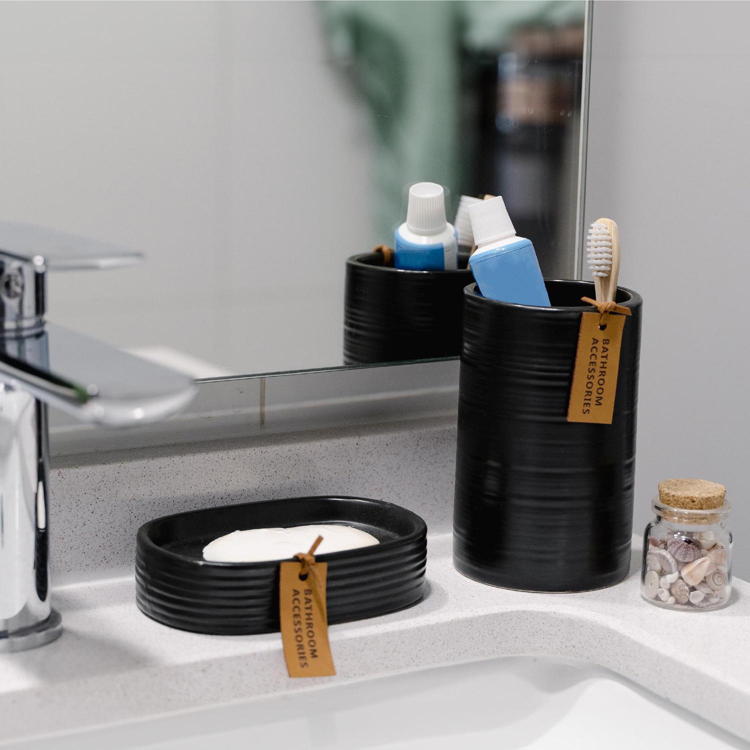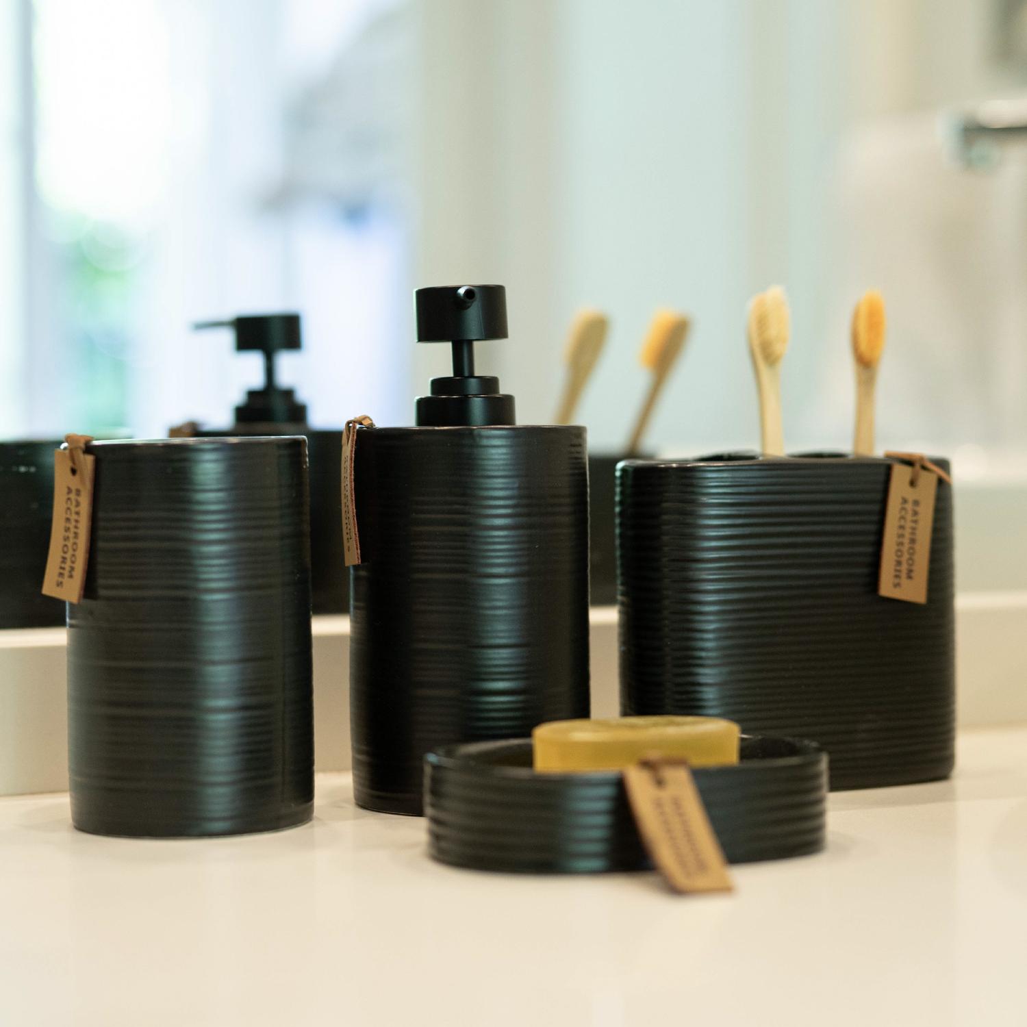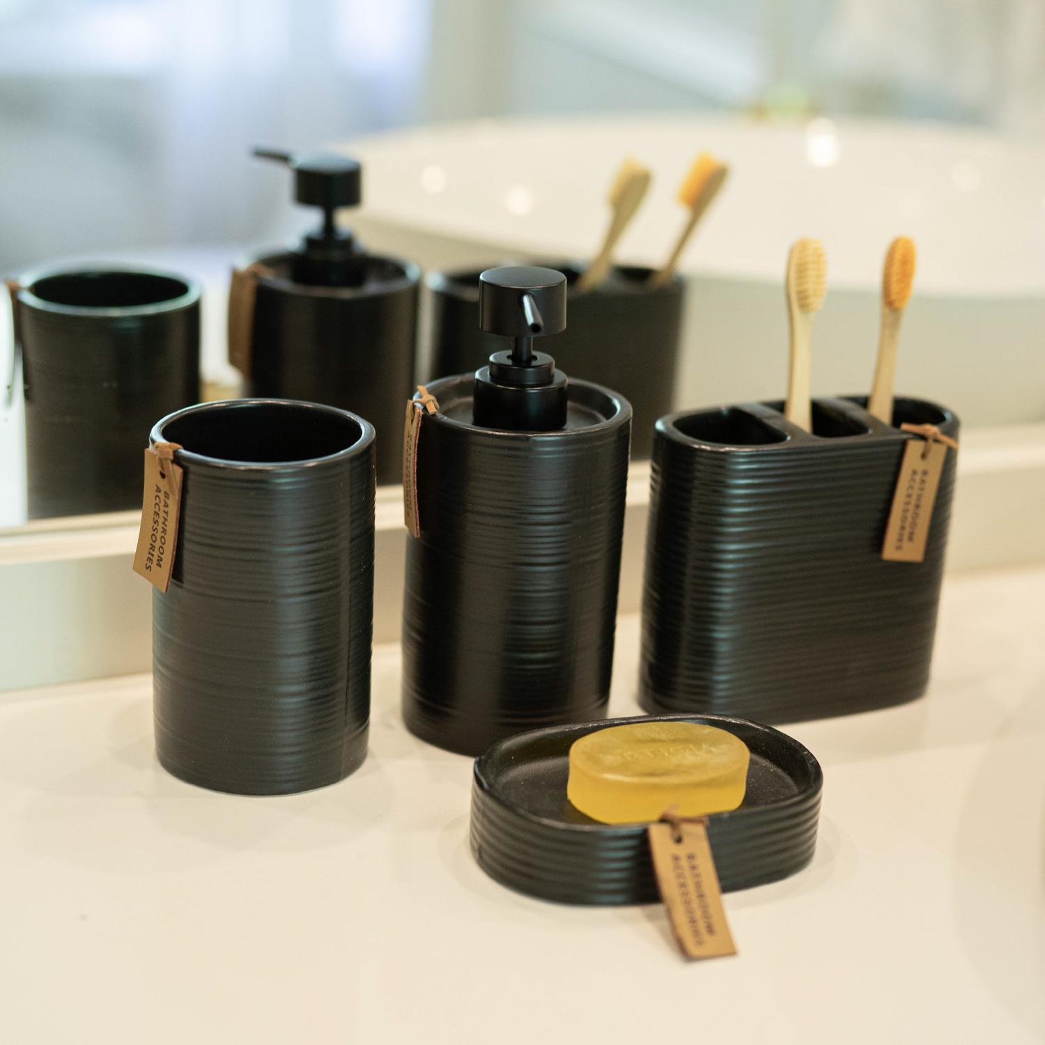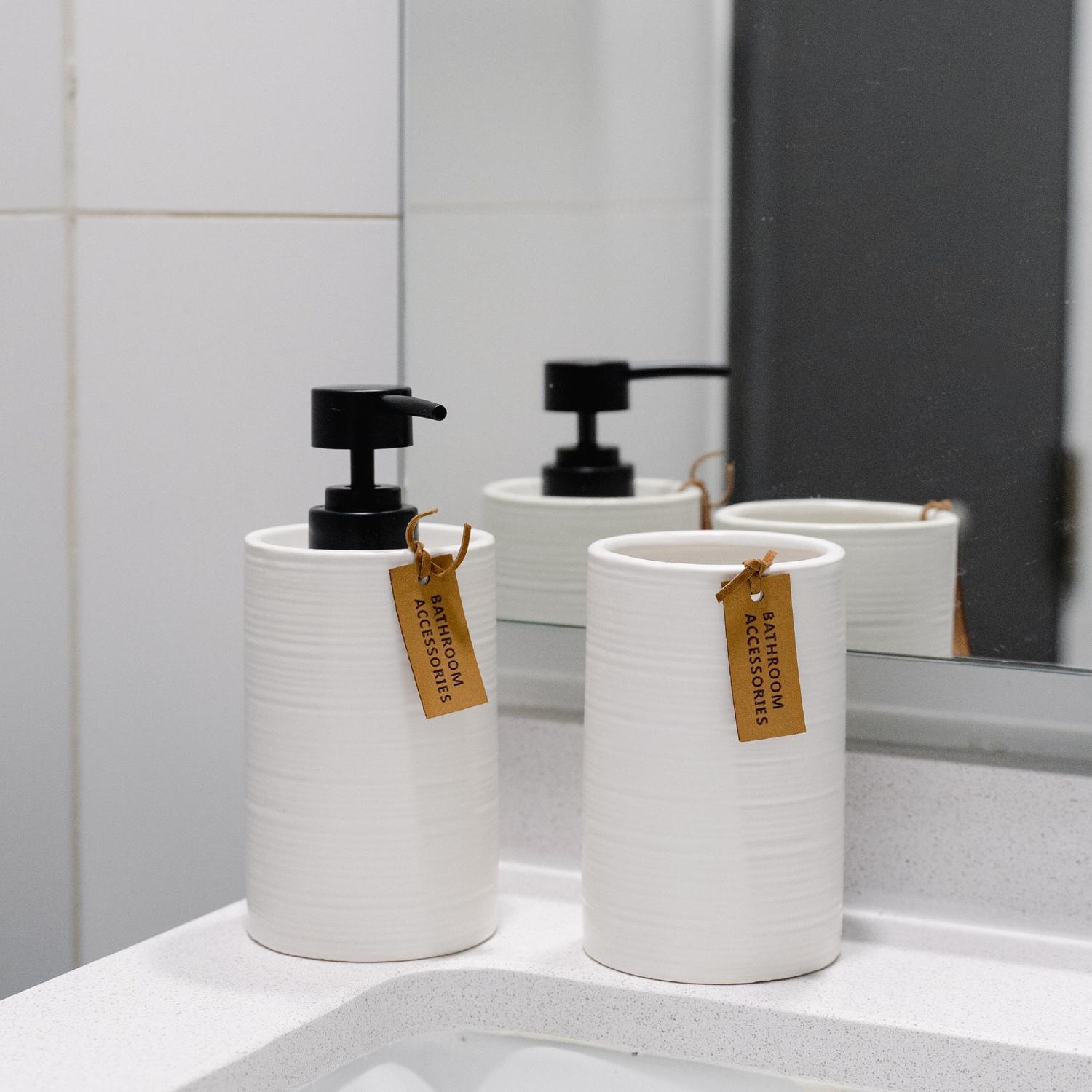 El set incluye 1 dispensador de jabón líquido, 1 vaso, 1 vaso para cepillos y 1 jabonera, proporcionando todo lo necesario para mantener tu baño organizado y con estilo. Su acabado en cerámica aporta una sensación de lujo, convirtiendo este set en un detalle imprescindible para un baño moderno y funcional.