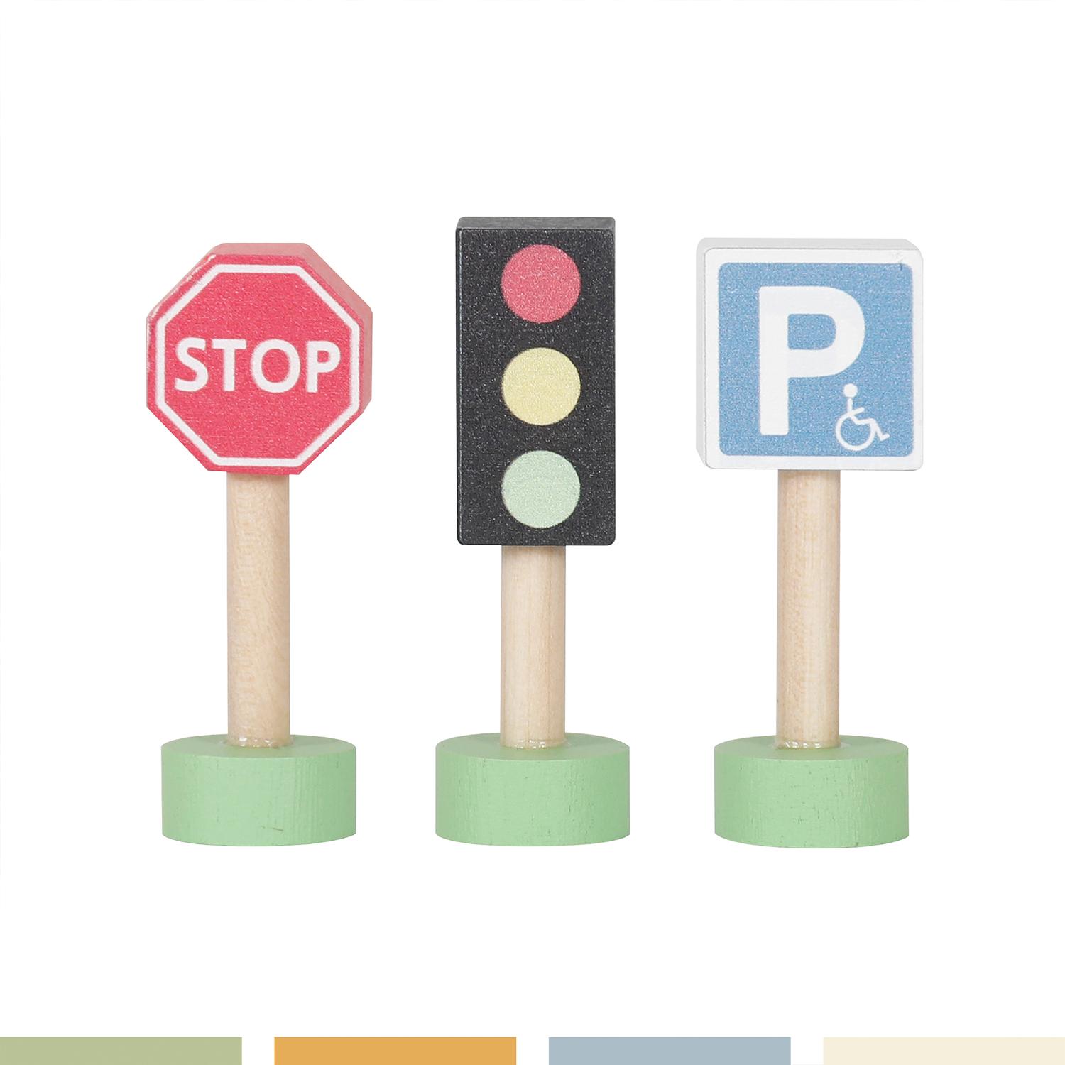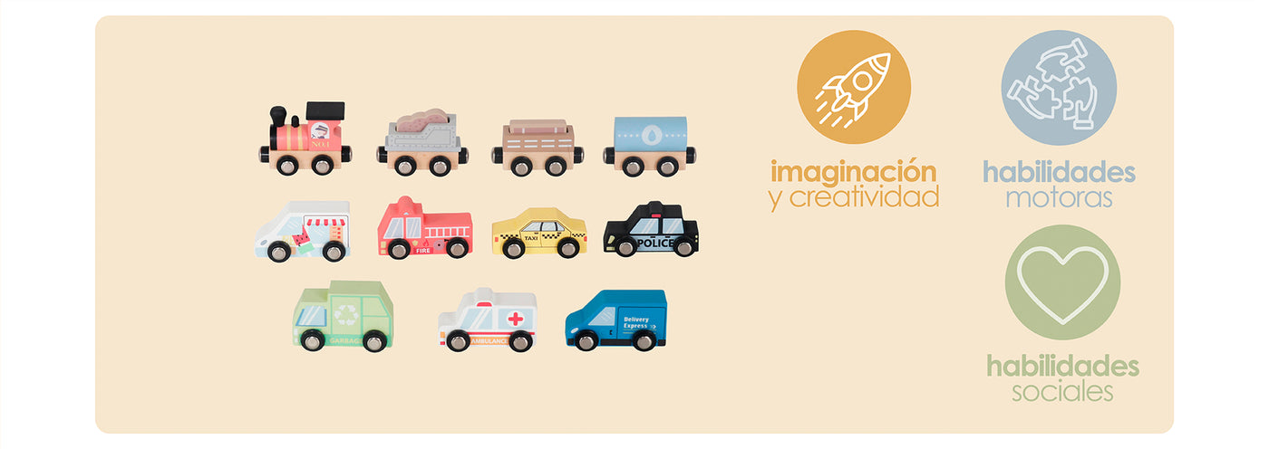 Incluye autos, tren, pistas encajables y señaléticas de madera.