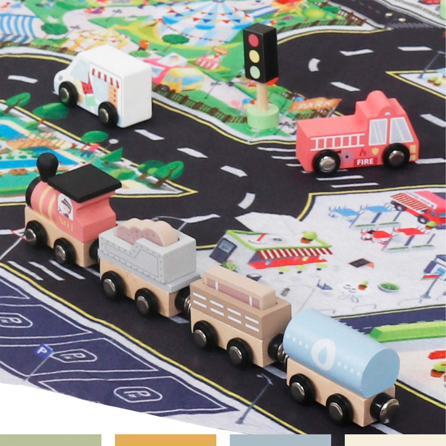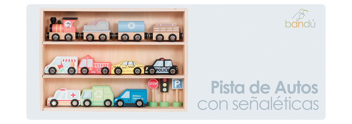 Set Autos de Juguete Tren Pista y Señaleticas Madera Bandú