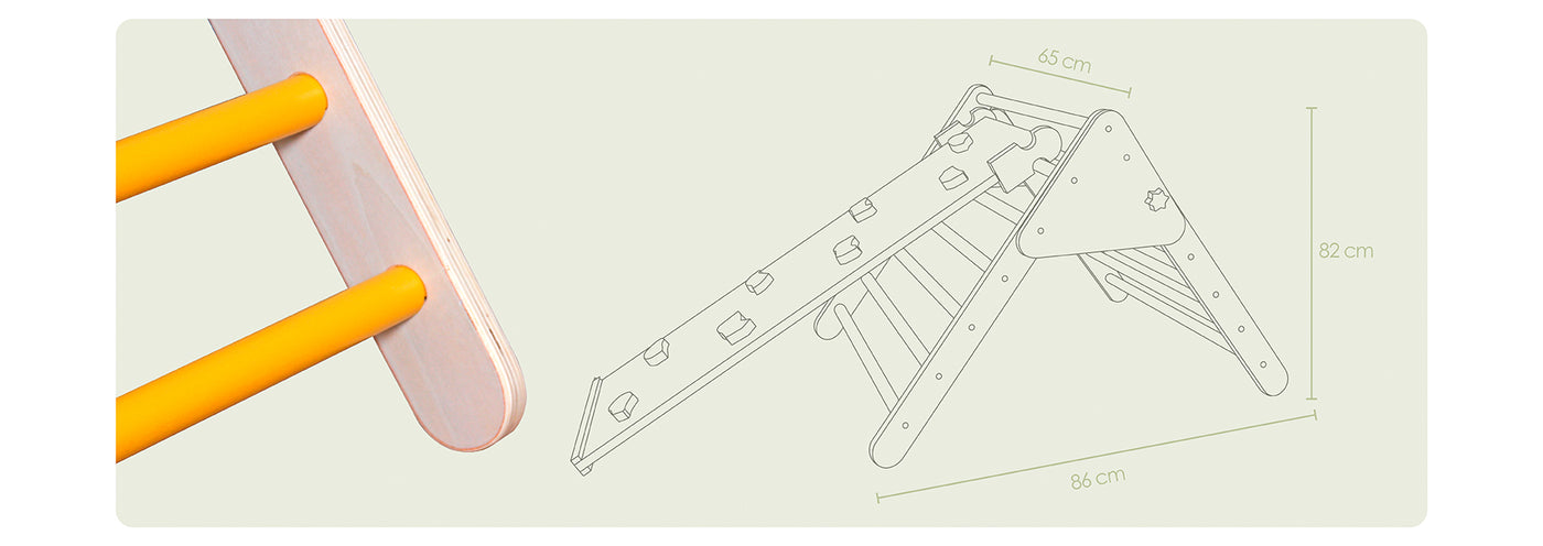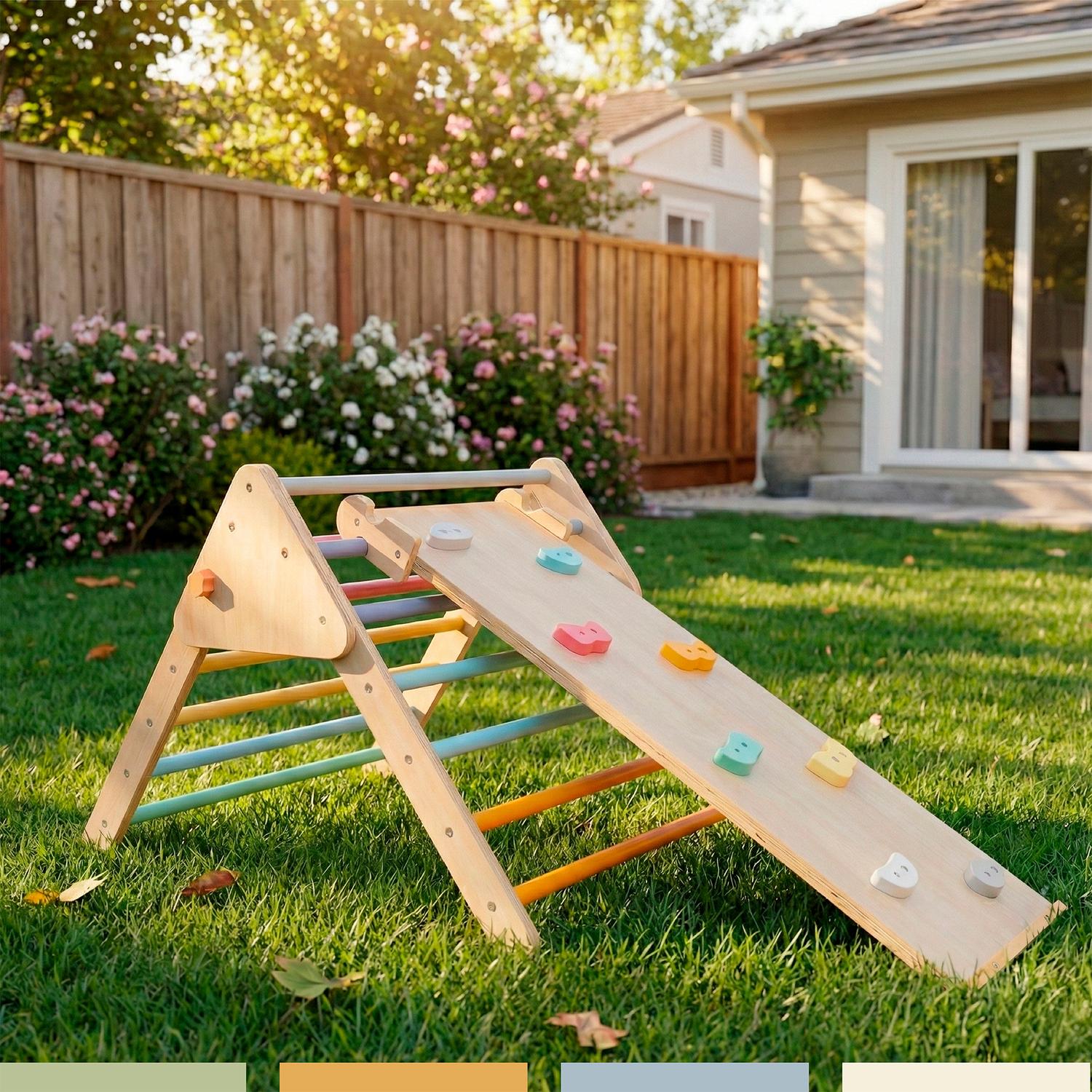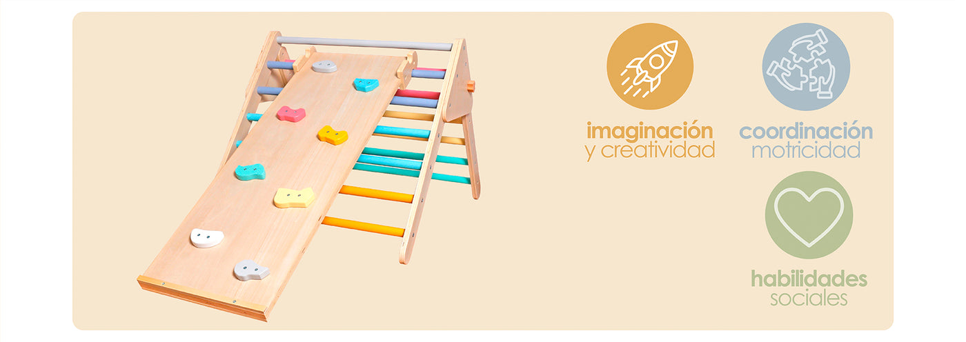 Incluye estructura tipo triángulo Pikler y rampa reversible (escalada y tobogán).