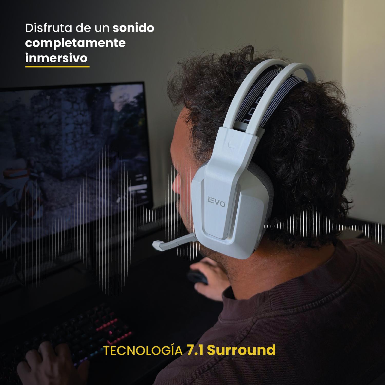 Con tecnología 7.1 Surround, siente cómo cada paso, disparo o nota musical te envuelve. Gracias a su latencia ultrabaja, cada sonido llega a tiempo, sin interrupciones, para una conexión perfecta con tus movimientos.
