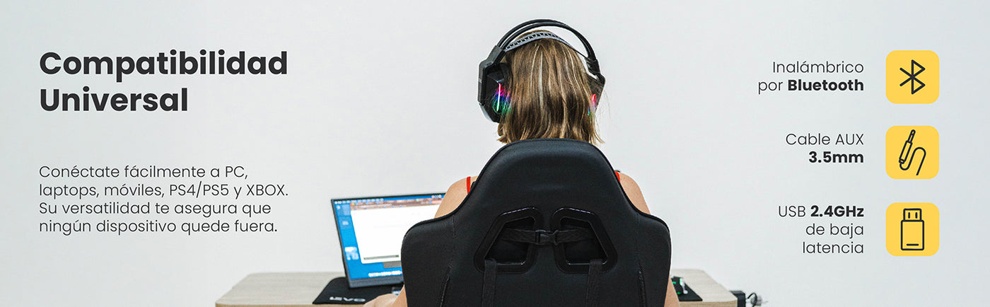 Conéctate fácilmente a PC, laptops, móviles, PS4/PS5 y XBOX. Su versatilidad te asegura que ningún dispositivo quede fuera, y puedes elegir entre 2.4G, Bluetooth o cable auxiliar 3.5 mm según tu necesidad. ¡La libertad nunca fue tan poderosa!
