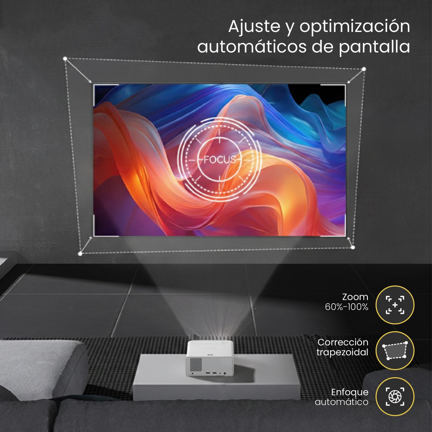 Zoom adaptable: Ajusta el tamaño de tu pantalla del 60% al 100% sin mover el proyector, adaptándose a cualquier espacio.