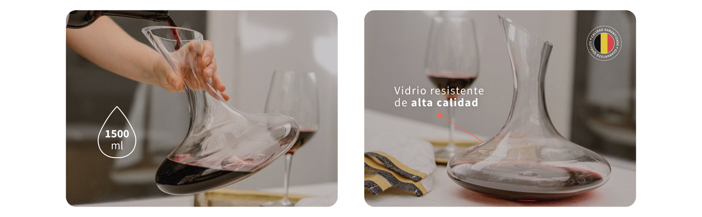 Con una capacidad de 1500ml, este decantador permite que el vino se oxigene a la perfección, despertando sus aromas y matices más profundos. Su agujero en la base no solo facilita un agarre cómodo y seguro, sino que también transforma el proceso de servir en una experiencia fluida y sin esfuerzo.