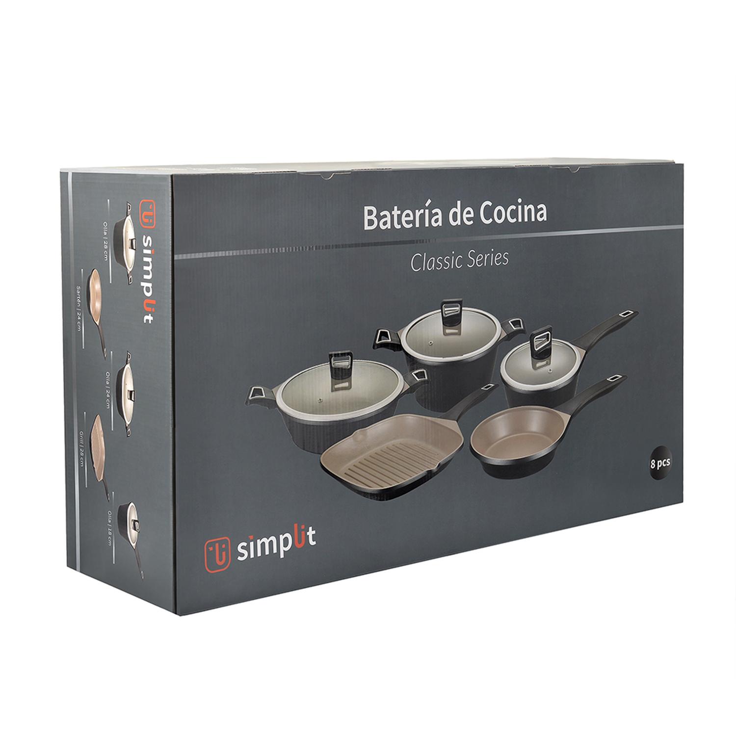 Batería de Cocina Antiadherente Classic 8 Piezas Simplit Nuestra Batería de Cocina Classic Series incluye ollas y sartenes de distintos tamaños y formas para brindarte un set completo con todo lo que necesitas. La batería es de aluminio fundido a presión con revestimiento antiadherente Pfluon qué puede conducir el calor de manera más rápida y uniforme. Su revestimiento exterior resiste a altas temperaturas. Las ollas tienen asas laterales de baquelita para mantener los mangos a baja temperatura durante la cocción. Es apta para todo tipo de cocinas incluidas las de inducción.