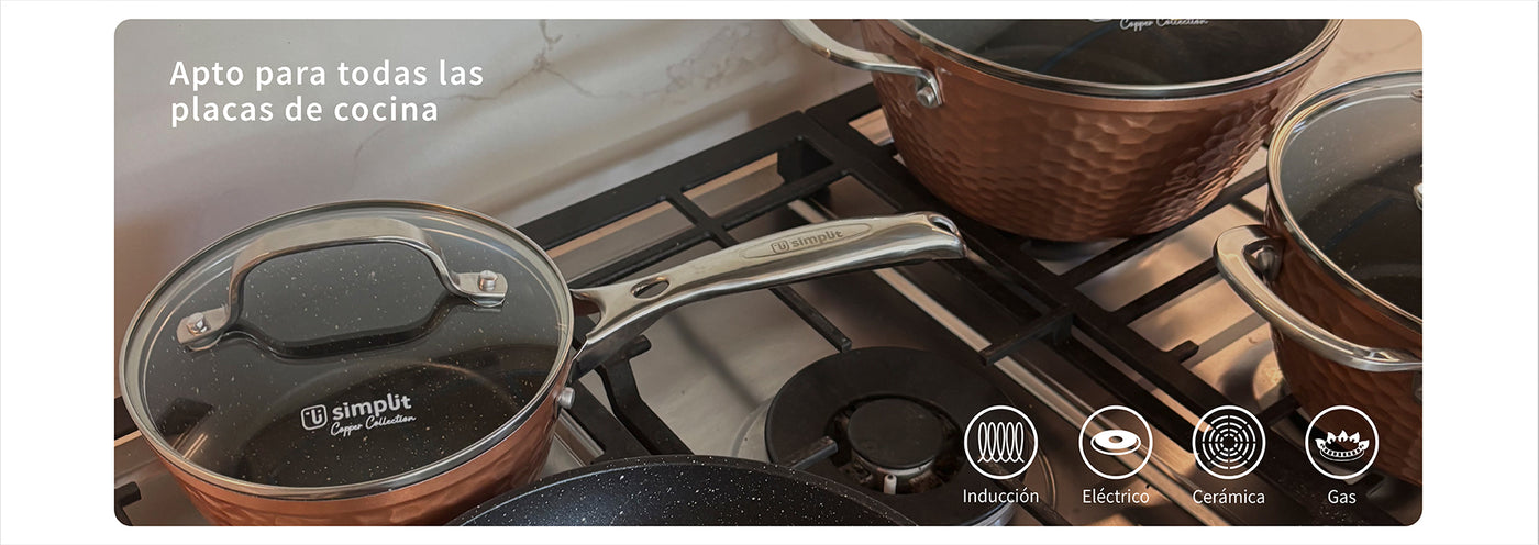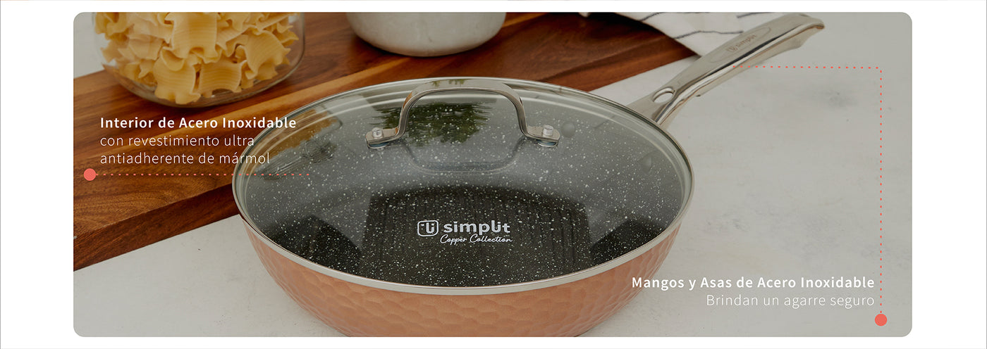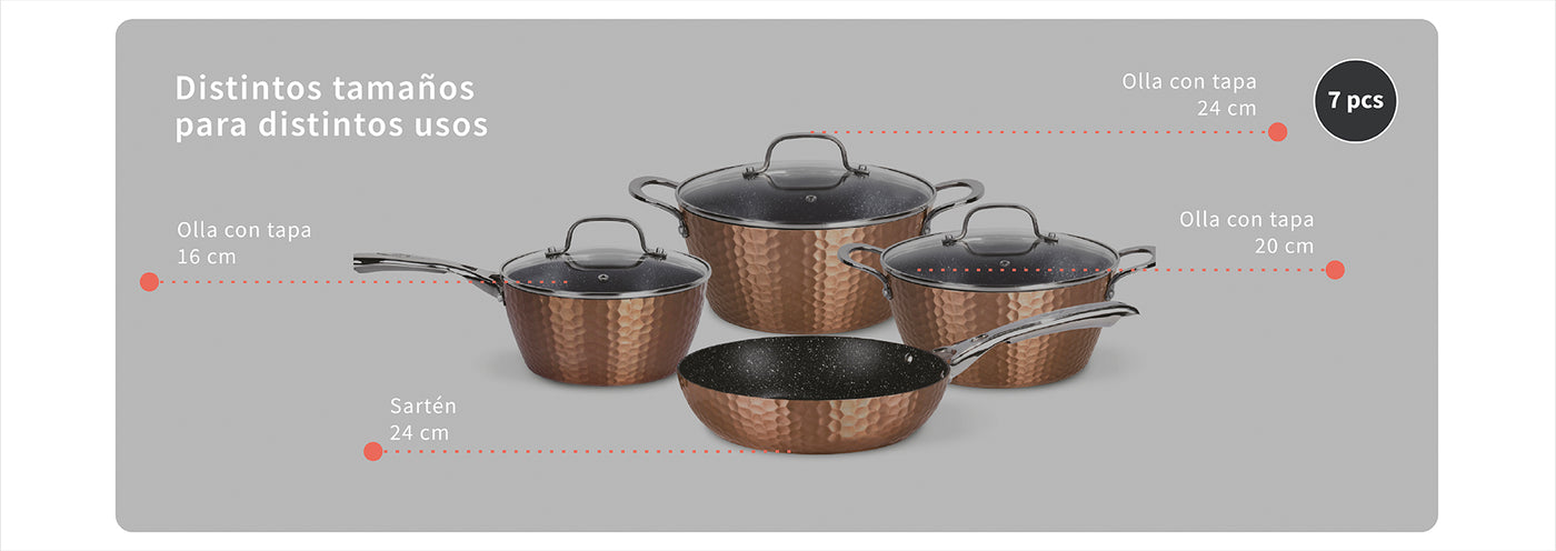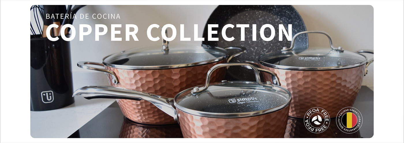Copper Collection está cuidadosamente diseñada para entregarte un producto duradero, con un hermoso acabado martillado que agrega un toque de calidez y elegancia a la cocina.