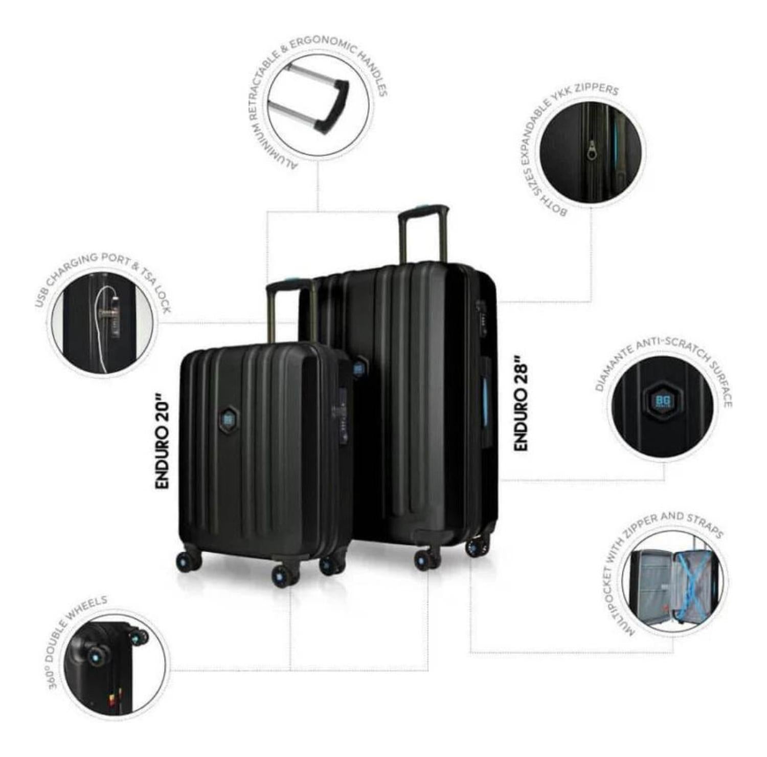 Con su exterior de diseño y color único, anti-scratch para disminuir el riesgo de rayones y resistente al agua, este Set de dos maletas ENDURO de BG Berlin entregan la solución perfecta para todas las necesidades de los viajeros.