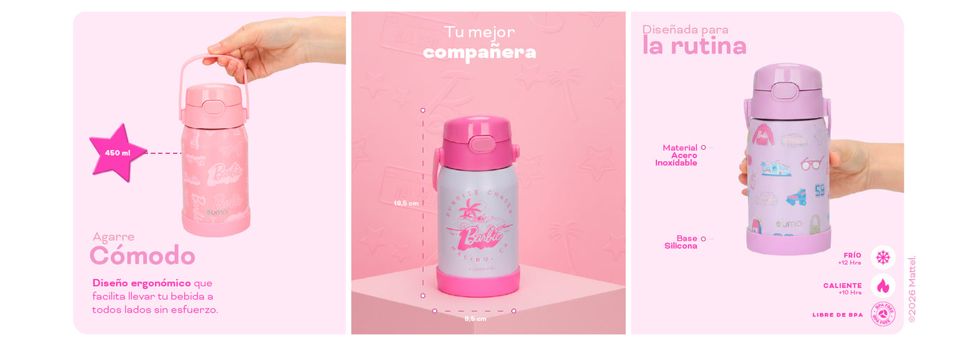Haz que la hidratación sea el momento favorito del día con esta Botella Térmica de Barbie. Pensada para acompañar la rutina escolar y los paseos de fin de semana, este modelo combina un tamaño compacto ideal para mochilas con la tecnología necesaria para mantener las bebidas frescas o calentitas durante todo el día. Es la elección perfecta para quienes buscan durabilidad sin perder el encanto y el estilo icónico de Barbie.