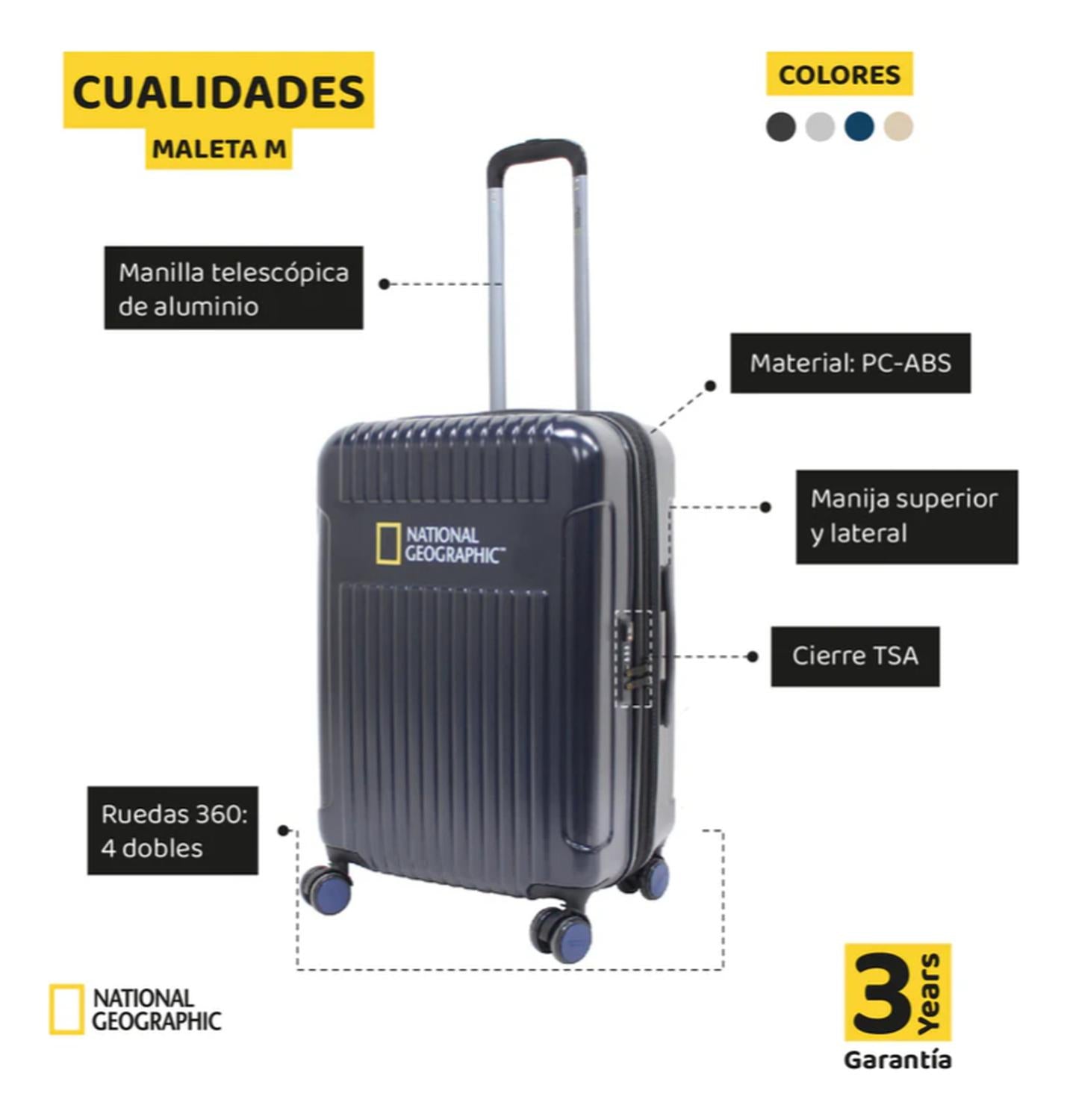 La increíble maleta Transit de NATGEO, tiene el tamaño perfecto para llevar todo lo que necesitas en tus viajes. (y si te falta espacio... es expandible!). Viene con 4 ruedas dobles con giro de 360° que distribuyen el peso para que puedas llevarla fácilmente a todos lados. Fabricada en material PC-ABS, un polímero que cuenta con una gran resistencia a los impactos y a los cambios de temperatura, lo que lo convierten en la opción ideal para entornos exigentes.