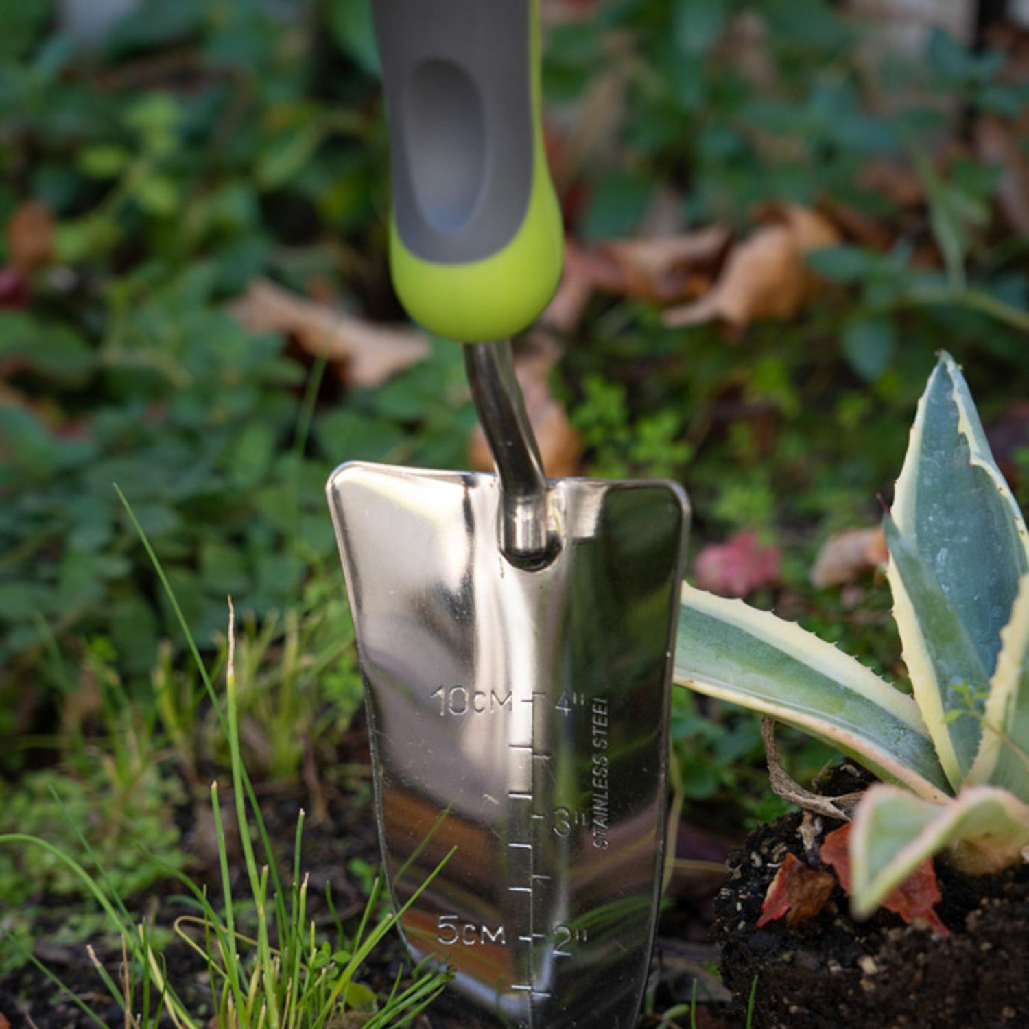 Esta pala jardinera de acero inoxidable es