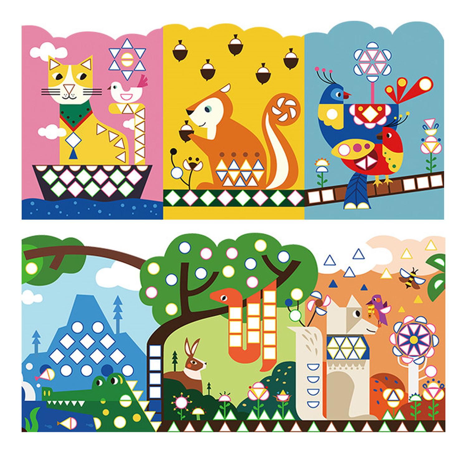 Poster panorámico de 105 cm de largo Stickers Geométricos Animales MiDeer, trae 6 imágenes por cada lado, ideal para que descubran las diferentes figuras geométricas, y puedan usar los stickers correspondientes para cubrirlas, asociando forma y color. Alrededor de 400 lugares para poner las pegatinas, ayuda a fomentar la concentración de los niños. Fomenta la observación, concentración y motricidad fina.