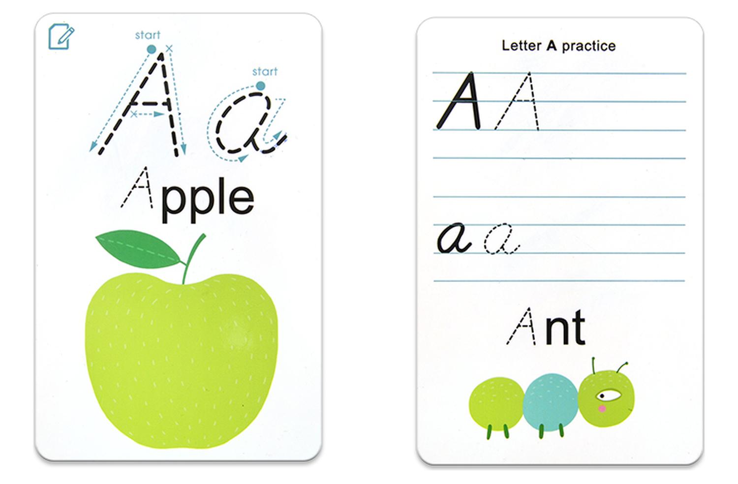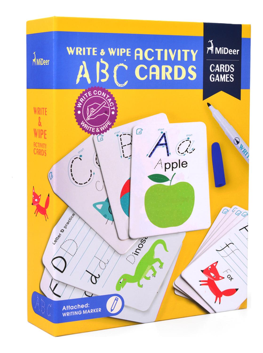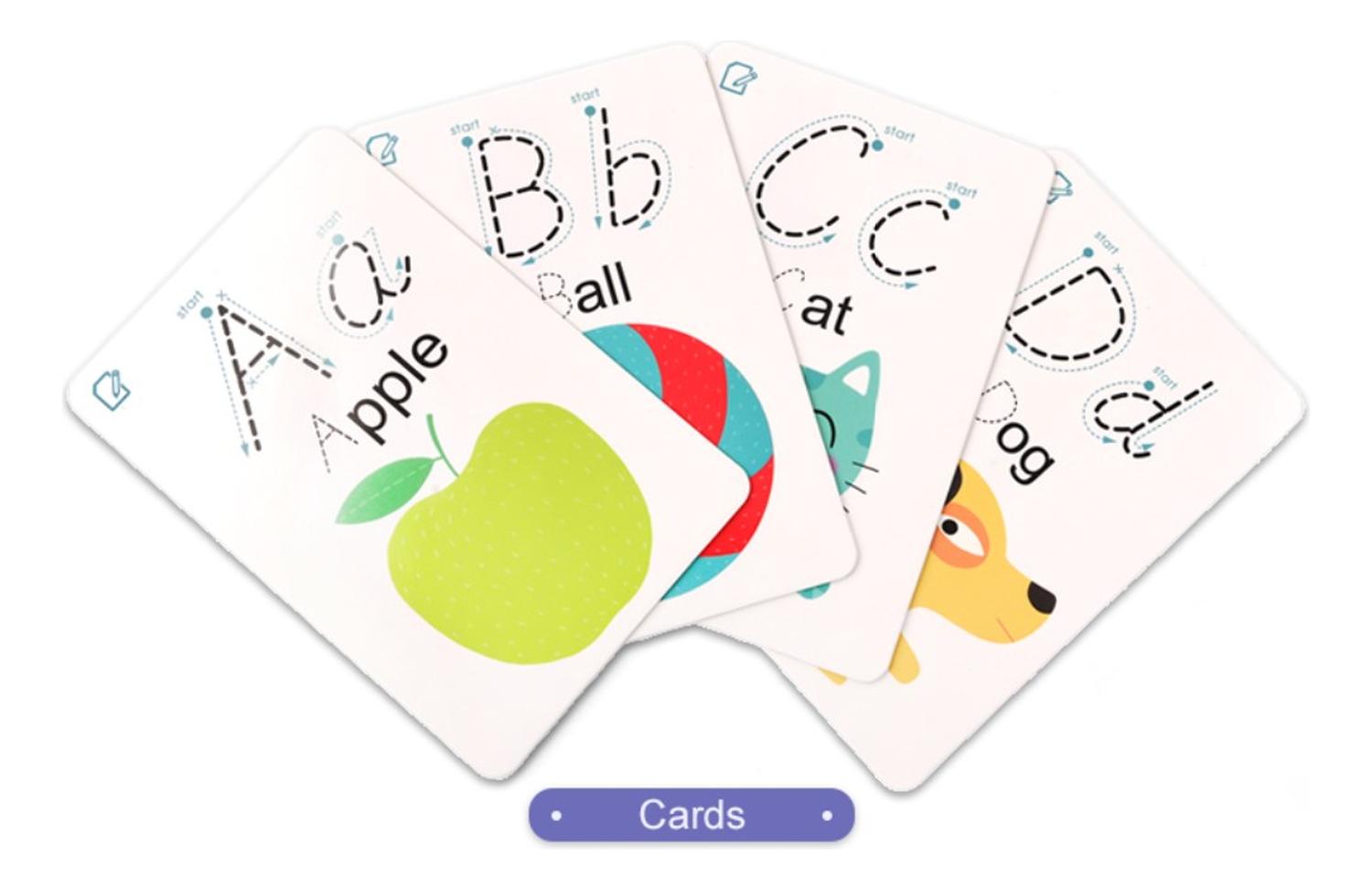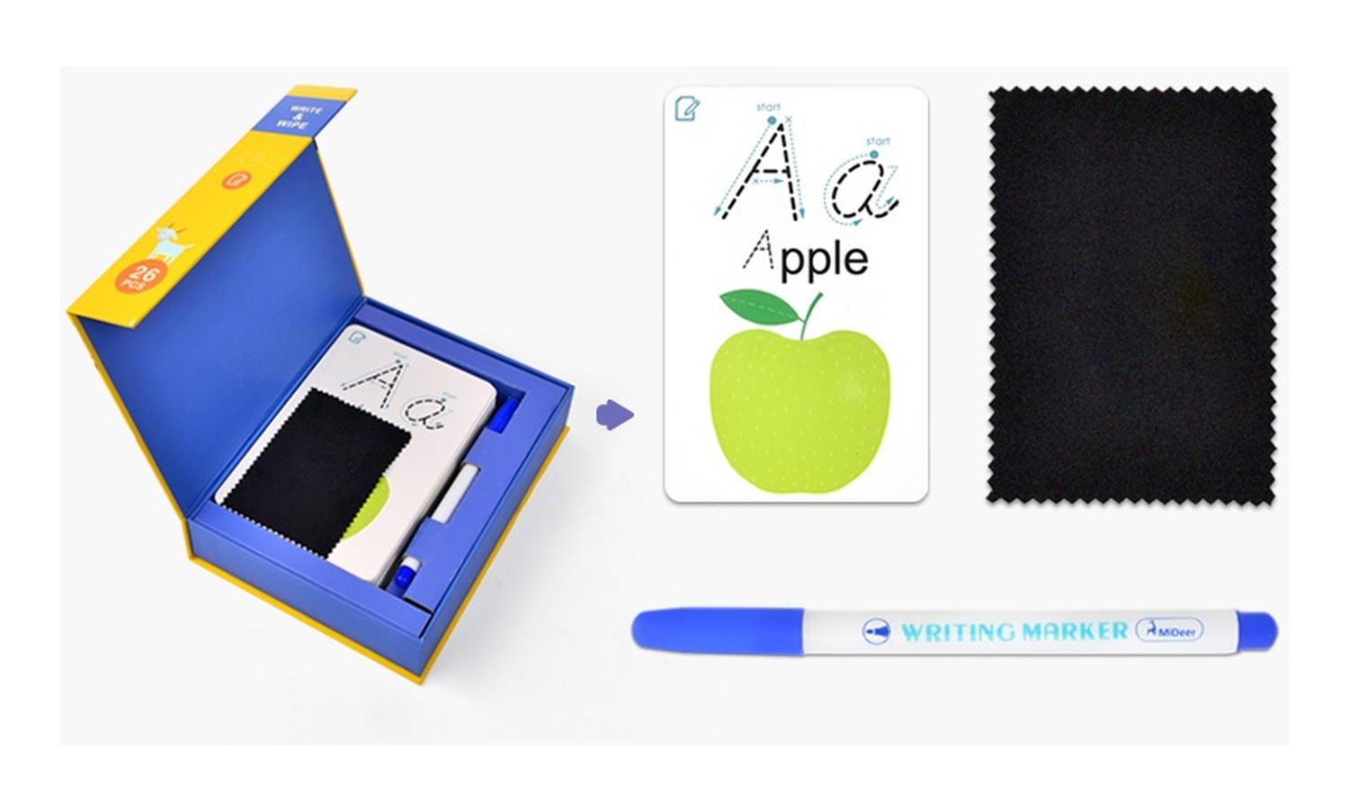El juego de tarjetas cognitivas contiene 26 tarjetas reutilizables donde puedes escribir, un marcador lavable y un paño para limpiar. Es una manera perfecta y divertida de ayudar a los niños a aprender las letras.