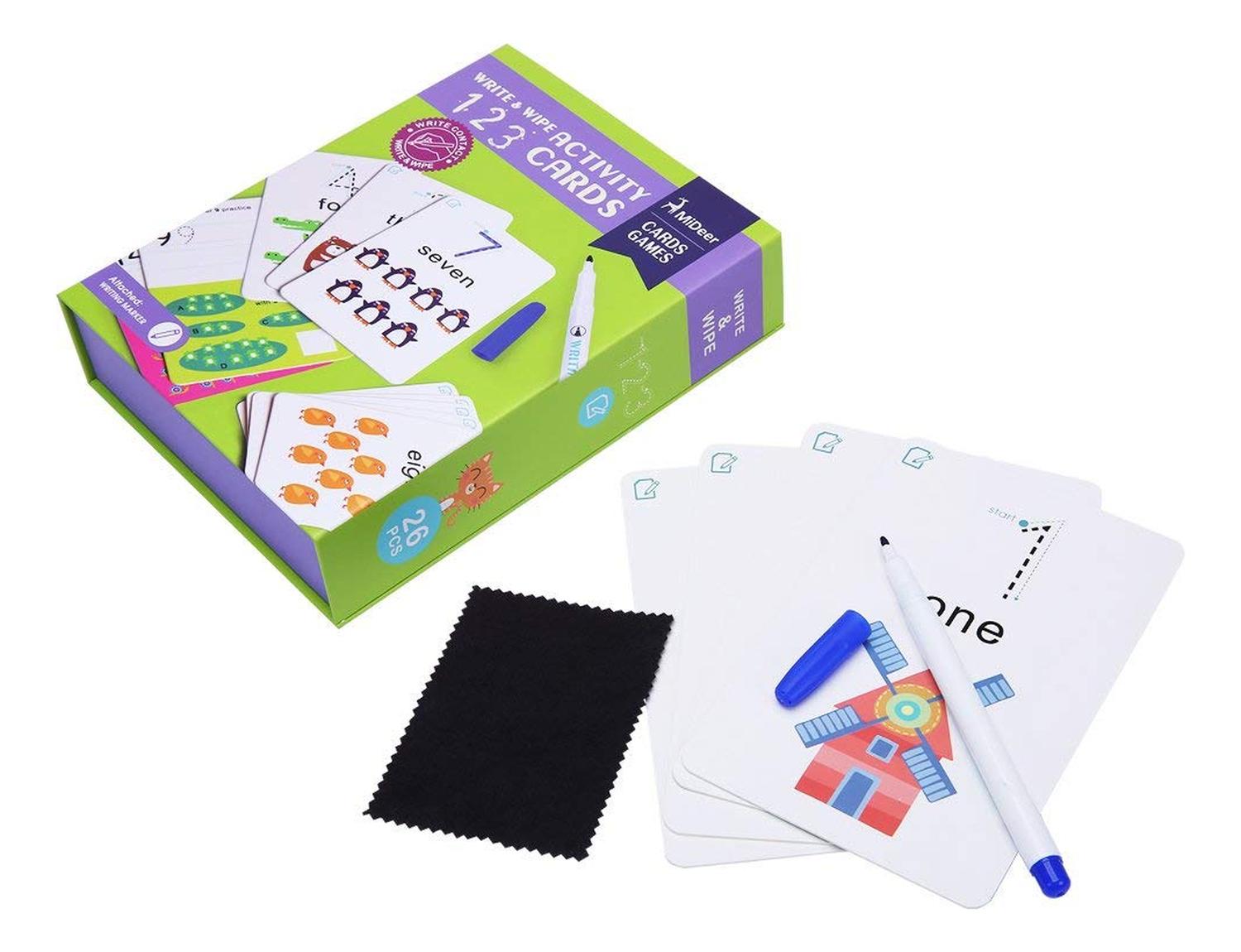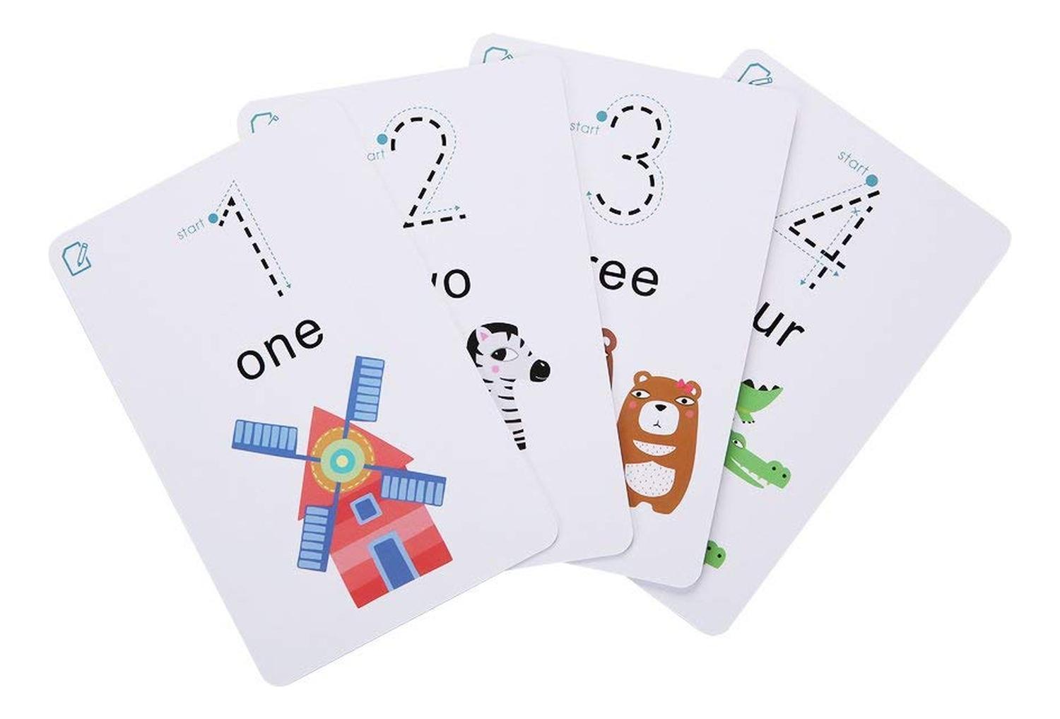 El juego de tarjetas cognitivas contiene 26 tarjetas reutilizables donde puedes escribir, un marcador lavable y un paño para limpiar. Es una manera perfecta y divertida de ayudar a los niños a aprender los números y asociación numero cantidad.
